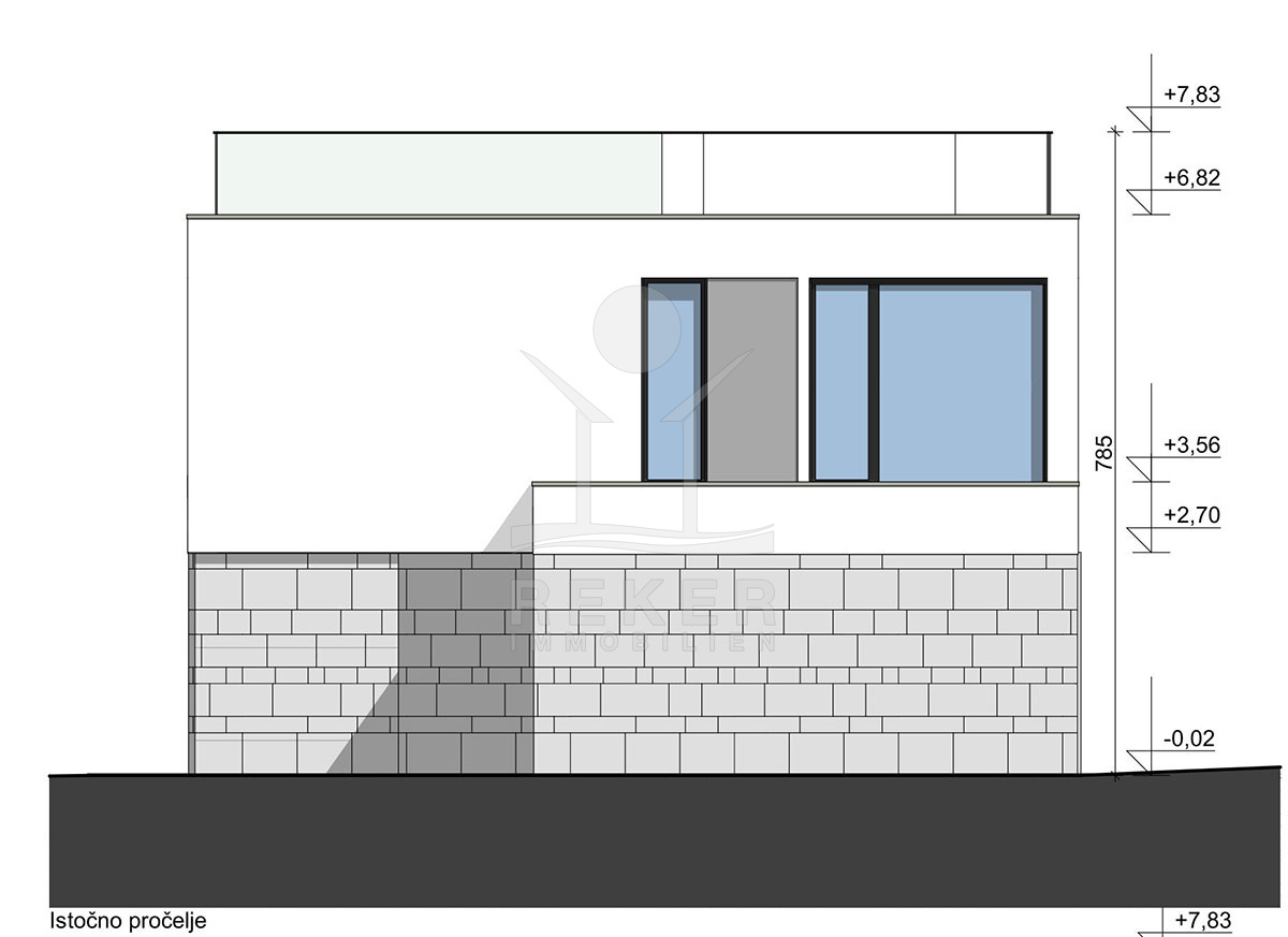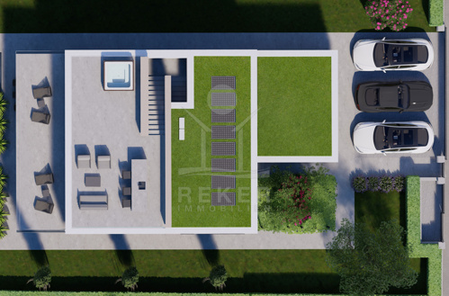 Nähe Poreč, in einer ruhigen Wohnstraße, wartet eine moderne Villa mit Meerblick. Nur zwei Kilometer Luftlinie trennen Sie von der Küste. Das Haus gehört zu einem kleinen Ensemble aus vier freistehenden Villen, jede auf eigenem Grundstück. Villa A bietet drei Pkw-Stellplätze und zusätzlichen Platz für Fahrräder. So bleibt es bequem, auch mit Gästen.