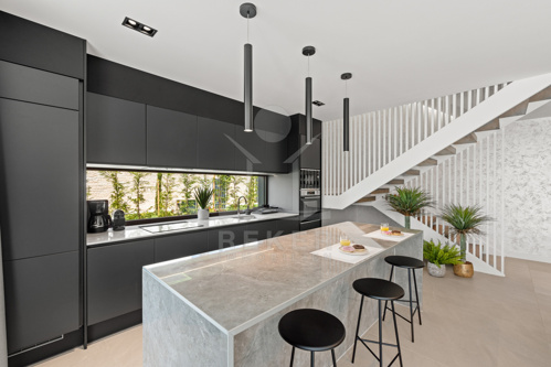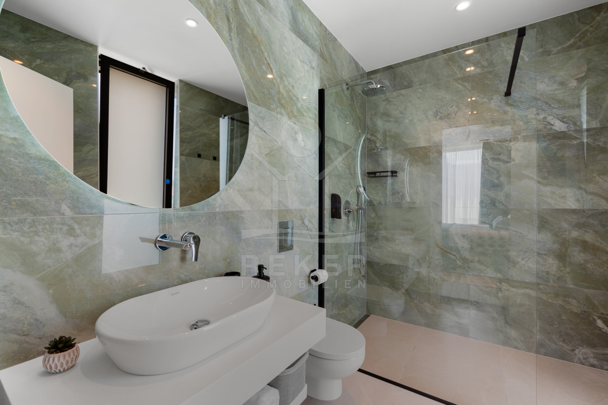 Die Ausstattung setzt hohe Maßstäbe: Fußbodenheizung mit Wärmepumpe, Klimatisierung über Samsung-Multi-Split mit Wind-Free™-Technologie, Smart-Home-Steuerung, Ajax-Alarmsystem, Videoüberwachung und eine Mercedes-Benz-Wallbox für Elektrofahrzeuge. Verarbeitete Materialien wie Kanfanar-Stein, italienische Designerfliesen, maßgefertigte Möbel und Sitzmöbel von Natuzzi schaffen ein edles Ambiente. Alle Räume sind mit Smart-TVs ausgestattet, die Schlafzimmer mit Boxspringbetten und Einbauschränken.