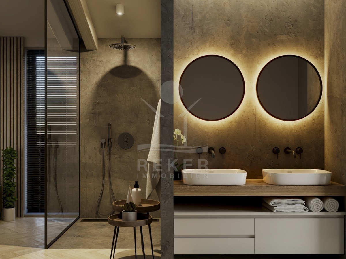 Im ersten Stock finden Sie drei Schlafzimmer, jedes mit eigenem Badezimmer, einen Fitnessraum mit Sauna, einen Balkon und eine überdachte Loggia. Hier können Sie Luxus und Komfort in vollen Zügen genießen. Das Highlight der Wohnung ist die wunderschöne Dachterrasse, von der aus Sie einen atemberaubenden Panoramablick genießen können. Hier können Sie entspannen und die Aussicht in vollen Zügen genießen.