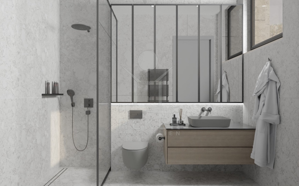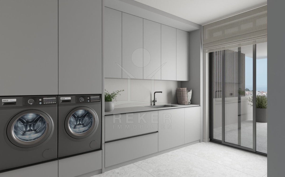 Der erste Stock beeindruckt mit drei Schlafzimmern, jeweils mit eigenem Badezimmer, einer Waschküche und großzügigen überdachten Terrassen. Jedes Detail der Villa besticht durch Eleganz und modernen Komfort.