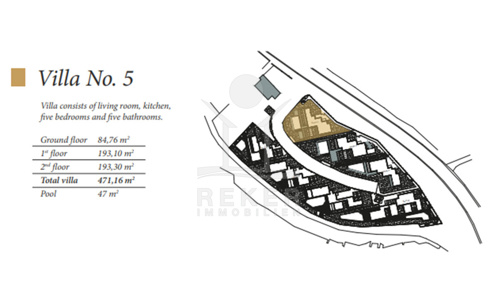 Die Villa ist mit Klimaanlage ausgestattet und wird vollständig möbliert verkauft. Der Wohnbereich erstreckt sich über insgesamt 471 m², aufgeteilt in 85 m² im Erdgeschoss, 193 m² im ersten Stock und weitere 193 m² im zweiten Stock. Das offene Konzept umfasst Wohn-, Ess- und Küchenzimmer, die einladend und luxuriös gestaltet sind. Die oberen Etagen bieten 5 geräumige Schlafzimmer und 5 Badezimmer, die viel Platz für Privatsphäre und Komfort bieten.