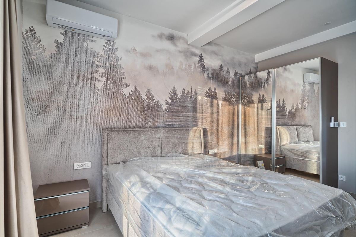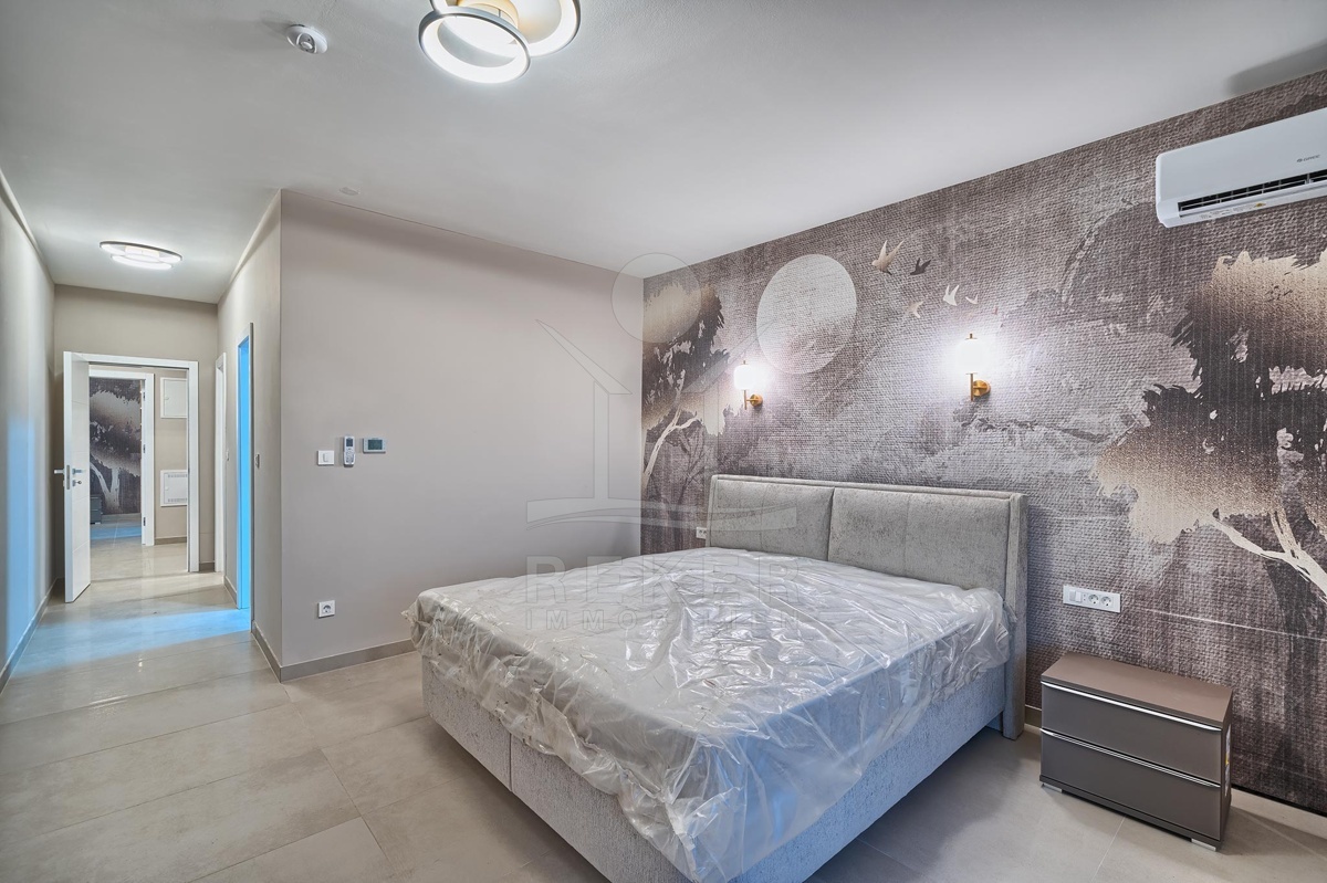 Die Villa erstreckt sich über drei Etagen mit insgesamt 225 m² Wohnfläche. Im Erdgeschoss erwarten Sie ein heller Wohnbereich mit offener Küche und direktem Zugang zur Terrasse sowie ein Schlafzimmer. Das Obergeschoss beherbergt drei weitere Schlafzimmer, jedes mit eigenem Bad und Balkon mit Glasgeländer und Meerblick. Im Untergeschoss ergänzen ein Abstellraum und der Technikraum für den Pool das Angebot. Die Ausstattung ist modern, hochwertig und komplett möbliert. Sie können sofort einziehen.