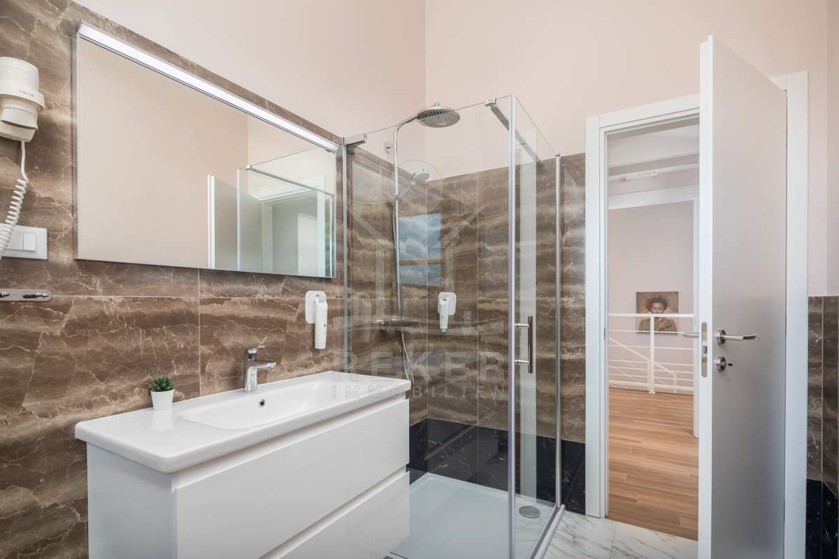 Dieses Haus wird vollständig möbliert verkauft und bietet im Erdgeschoss ein offenes Konzept mit einem stilvollen Eingangsbereich, einem geschmackvoll gestalteten Flur und einem großzügigen Wohn-, Ess- und Küchenbereich mit erstklassiger Einrichtung. Vom Erdgeschoss gelangen Sie auf die Terrasse und in den Außenbereich mit einem erfrischenden Pool. Hier befinden sich auch 2 Schlafzimmer mit eigenen Badezimmern, die jeweils über eine Dusche en Suite verfügen.
