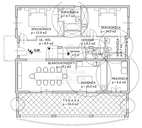 Der Außenbereich bietet durchdachten Komfort. Eine überdachte Terrasse (26 m²) im Erdgeschoss und ein Balkon in gleicher Größe auf der Wohnebene darüber erweitern den Wohnraum ins Freie. Parkplätze sind auf dem Grundstück vorhanden.