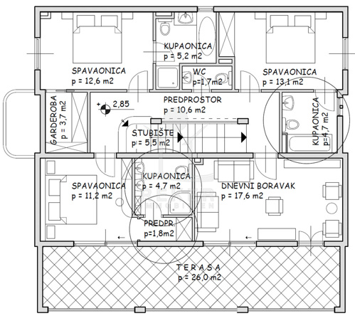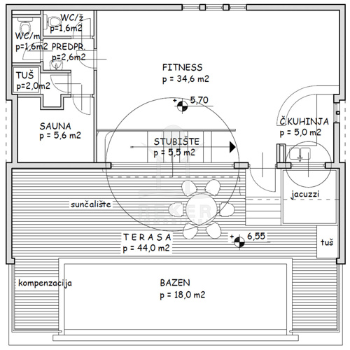 Auch innen überzeugt die Villa mit Großzügigkeit und Struktur. Im Erdgeschoss: Küche mit Essbereich, zwei Schlafzimmer mit eigenen Bädern, dazu ein Gäste-WC. Im Obergeschoss: ein separates Wohnzimmer, drei weitere Schlafzimmer – ebenfalls mit Bad en suite – und ein weiteres Gäste-WC. Ganz oben dann der Rückzugsort für Körper und Geist: Sauna, Fitnessraum, eine Sommerküche und die Dachterrasse. Die Dachterrasse mit 44 m² schafft ein echtes Highlight: Hier wartet ein Jacuzzi mit weitem Blick aufs Meer – für private Entspannungsmomente mit Stil. Alles da – für Menschen, die nichts vermissen wollen.
