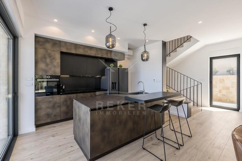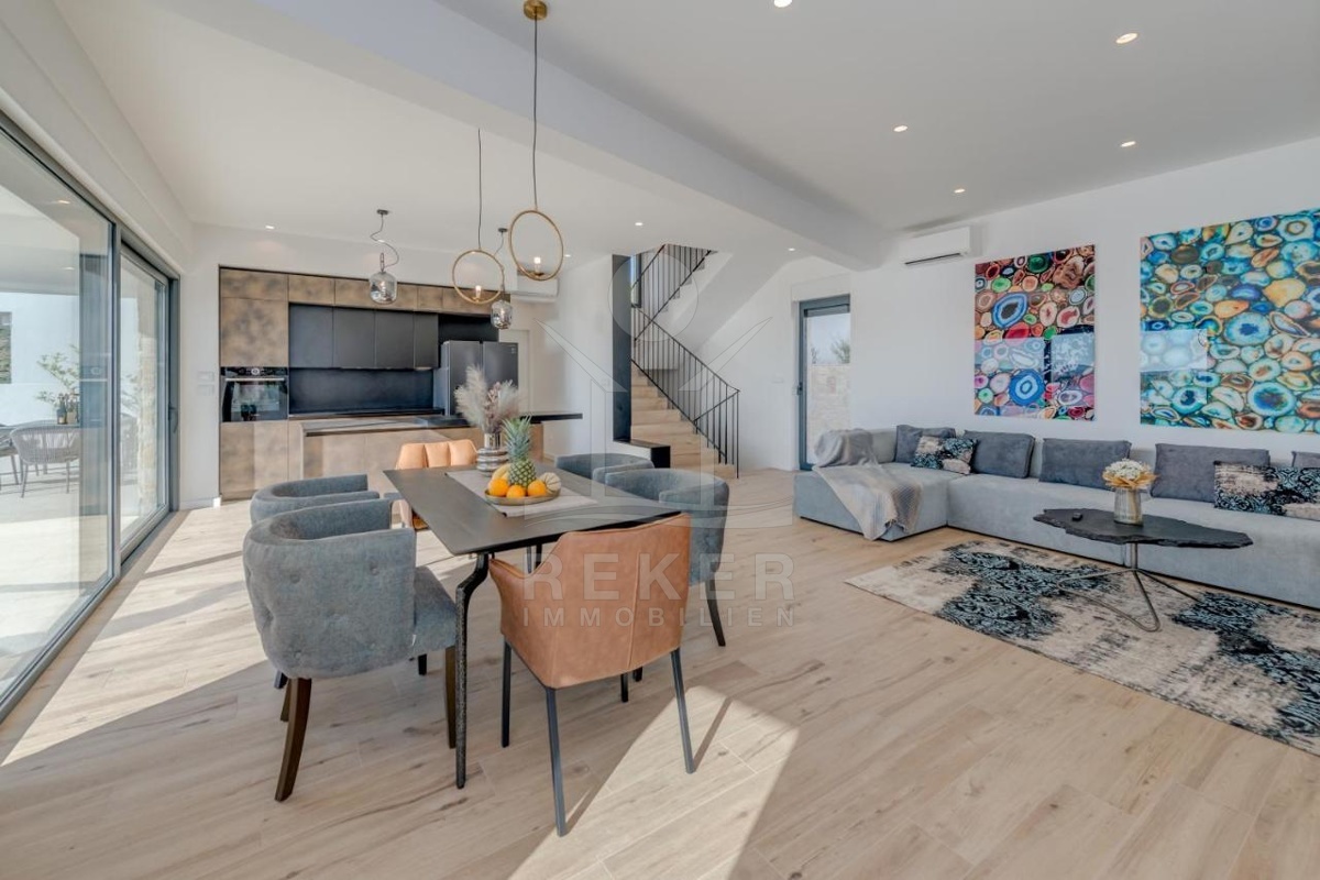Der Zugang zur Villa erfolgt über eine elegante Beton-Außentreppe. Die Anlage ist voll möbliert und bietet eine erstklassige Ausstattung, die für höchsten Komfort und Luxus sorgt. Im Erdgeschoss erwartet Sie ein offener, heller Wohn- und Essbereich mit einer modernen Küche. Hohe Wände und bodentiefe Fensterelemente ermöglichen einen direkten Zugang zur Terrasse und schaffen eine luftige und einladende Atmosphäre. Hier können Sie sich wie zu Hause fühlen und jeden Moment in vollen Zügen genießen.