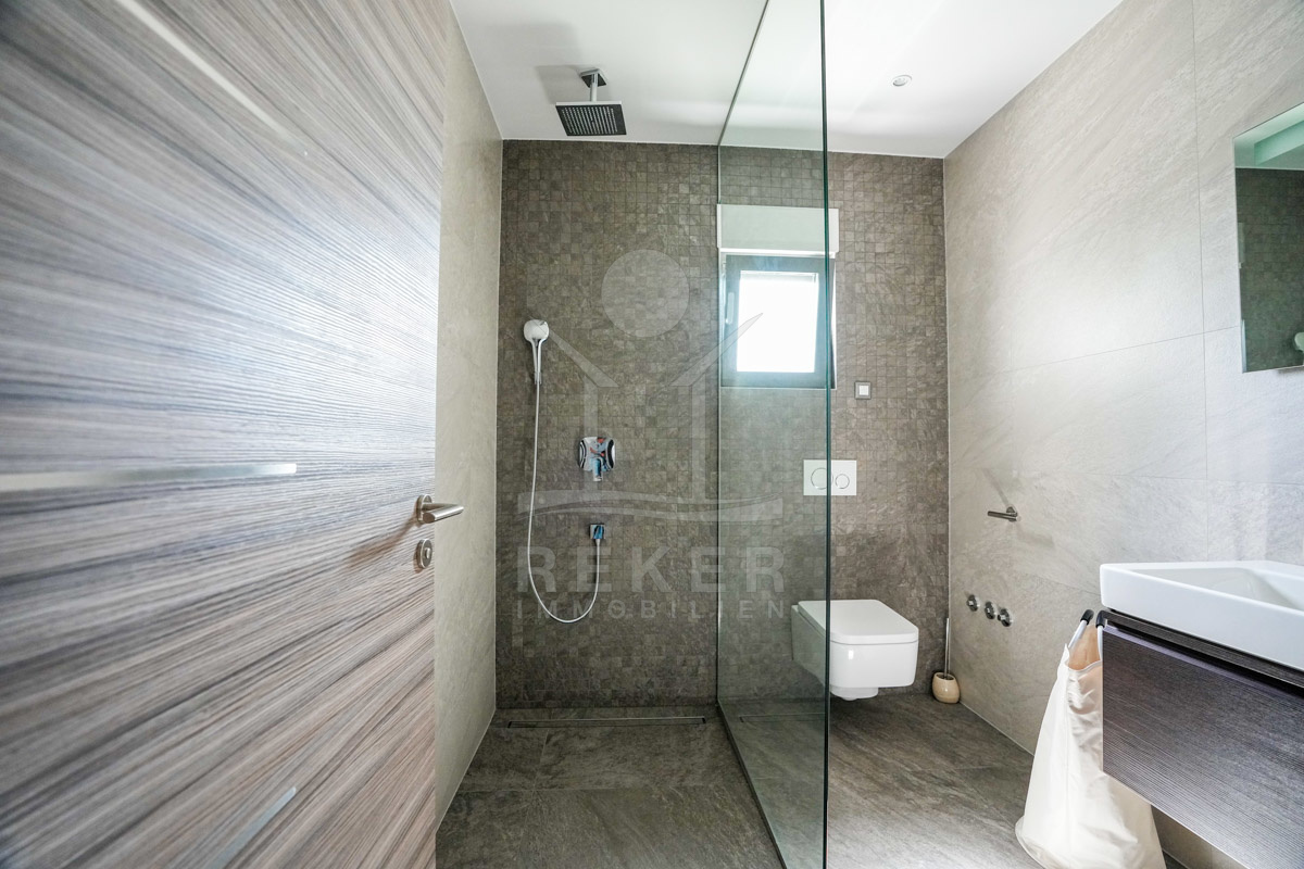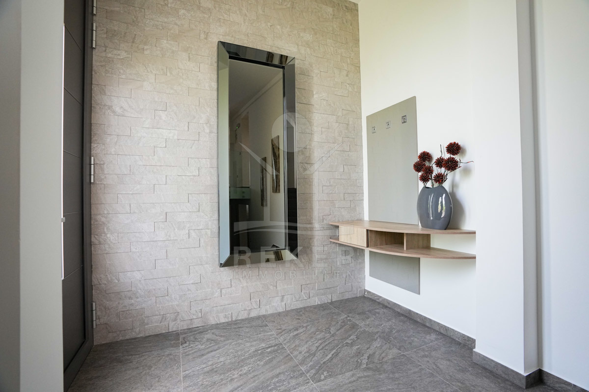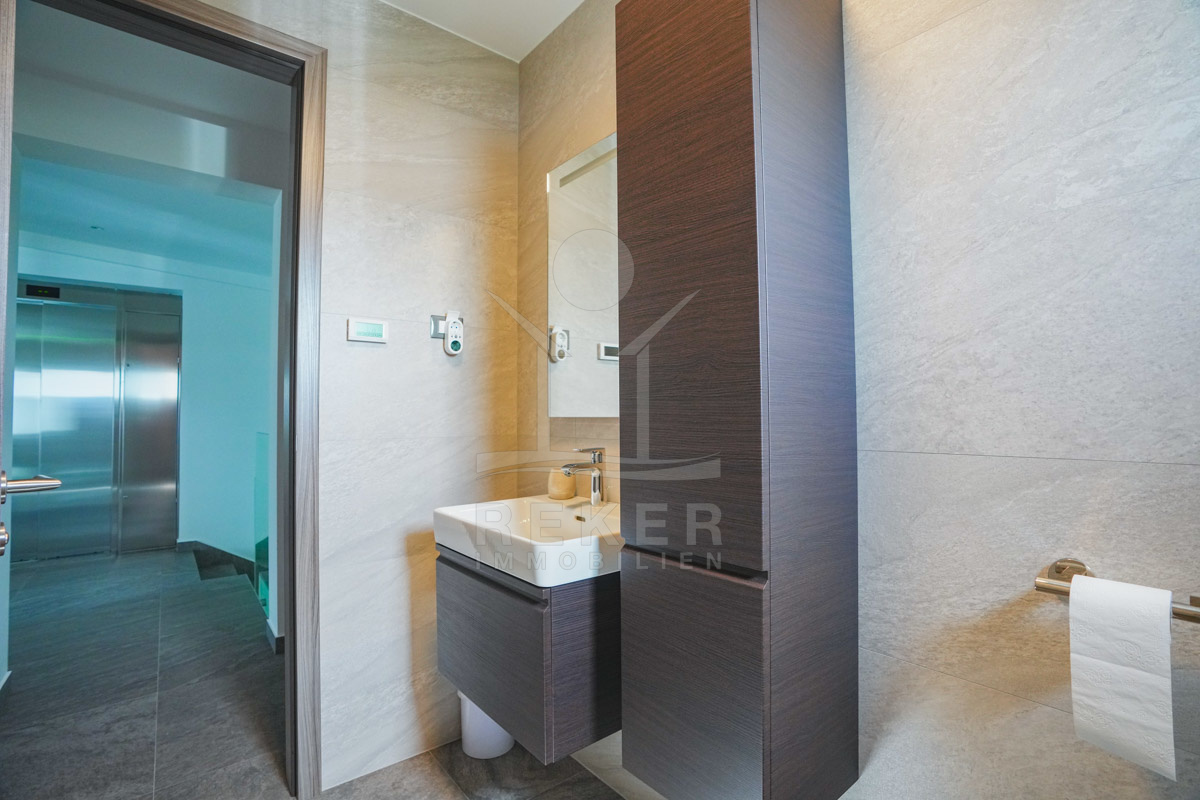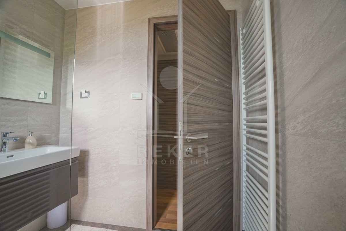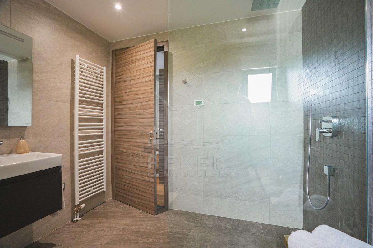 Im Erdgeschoss erwartet Sie ein luxuriöser Wellnessbereich mit Whirlpool, Sauna, Dusche und WC, sowie ein Waschraum für zusätzlichen Komfort.