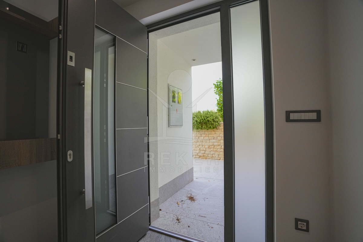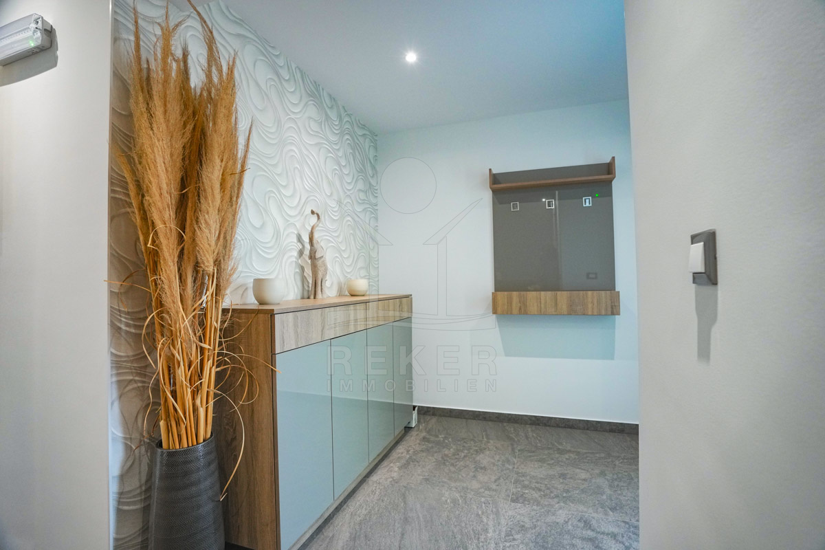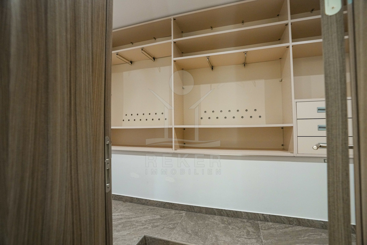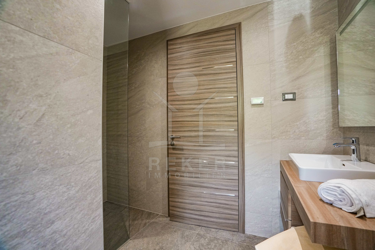 Im Erdgeschoss erwartet Sie ein luxuriöser Wellnessbereich mit Whirlpool, Sauna, Dusche und WC, sowie ein Waschraum für zusätzlichen Komfort.