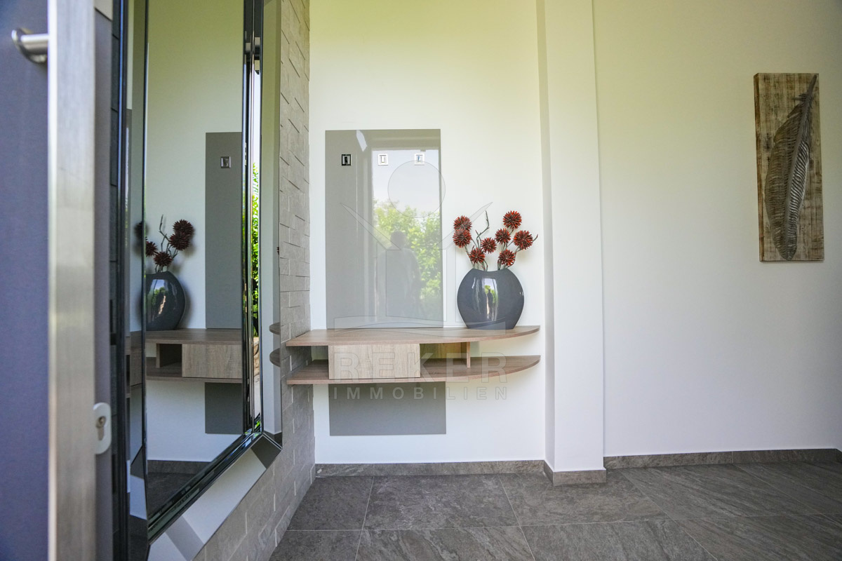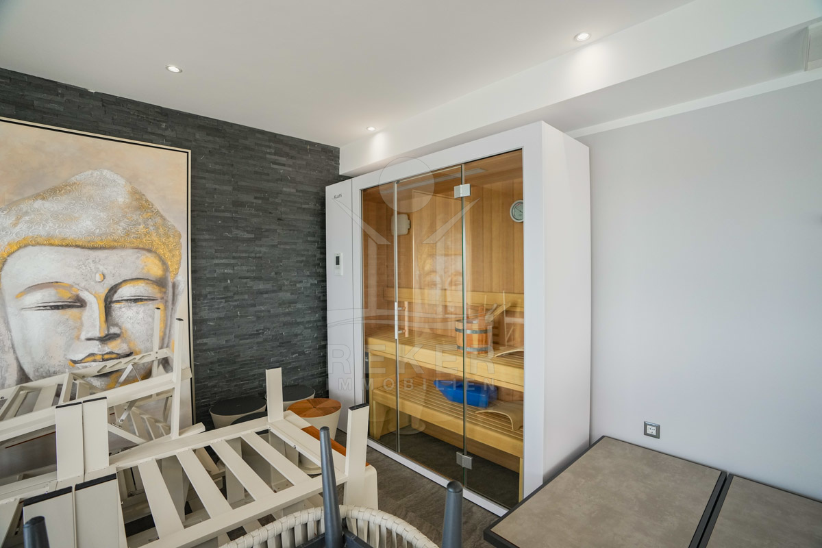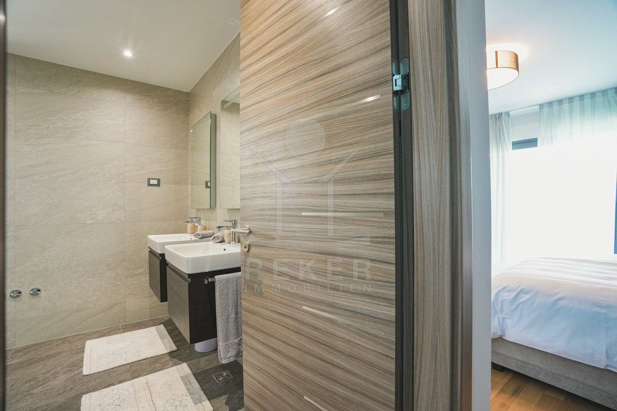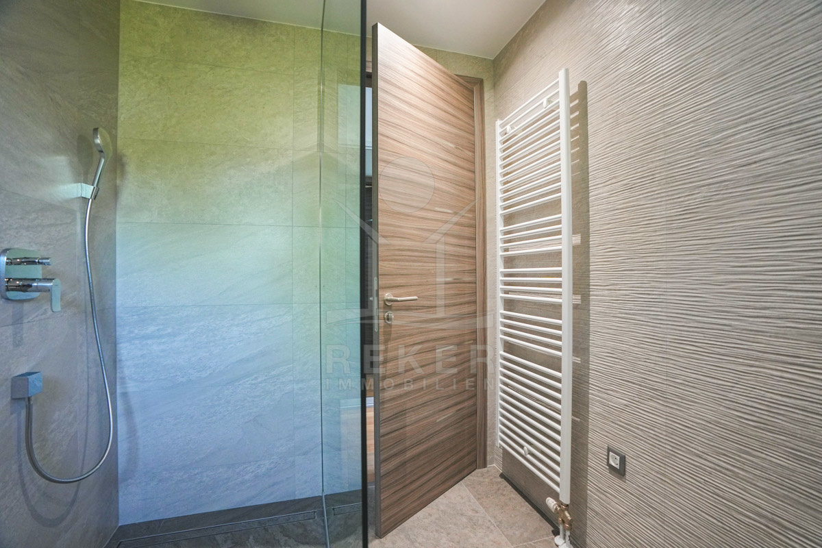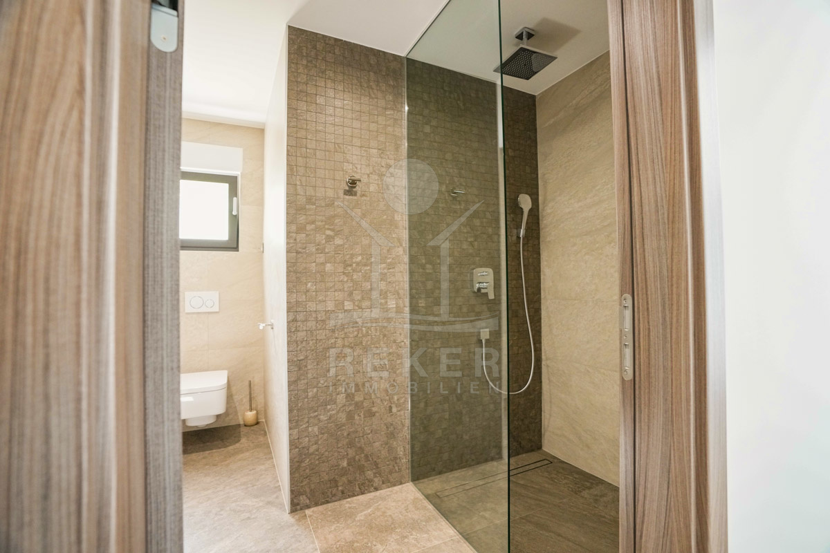Im Erdgeschoss erwartet Sie ein luxuriöser Wellnessbereich mit Whirlpool, Sauna, Dusche und WC, sowie ein Waschraum für zusätzlichen Komfort.