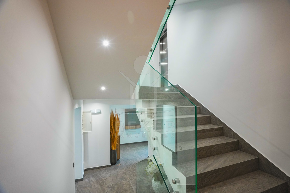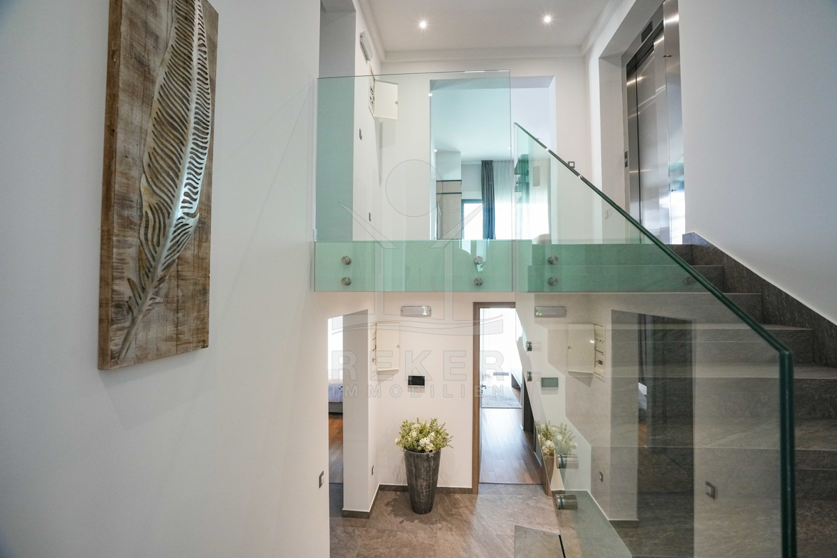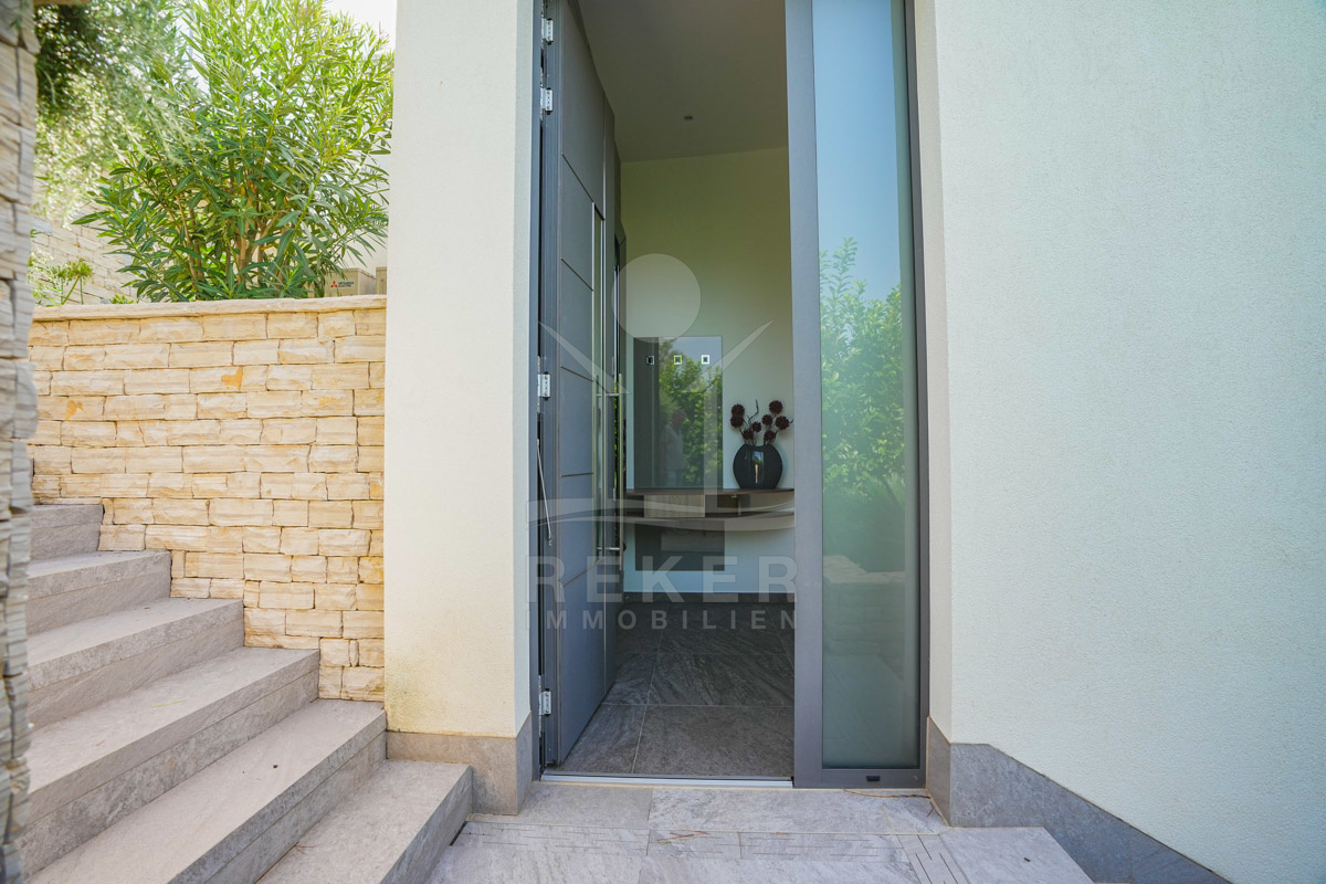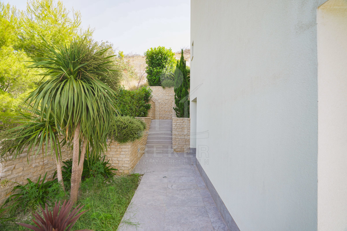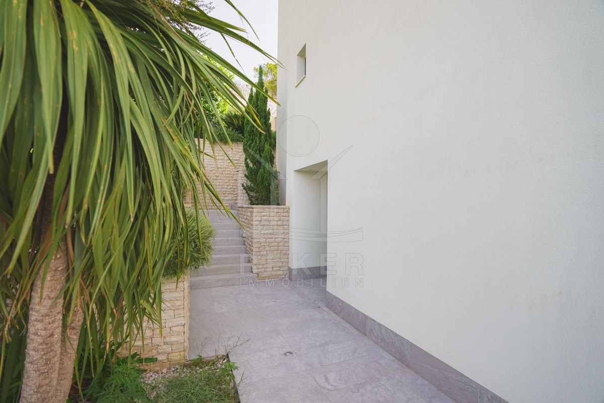 Das Anwesen und bietet auf einem 592 m² großen Grundstück am Hang pure Eleganz und erstreckt sich auf 3 Ebenen mit insgesamt 340 m² Wohnfläche. Die Verwendung von hochwertigen und edlen Materialien sowie Ausstattungsmerkmalen wie Solaranlage und Aufzug heben diese Villa von anderen ab. Genießen Sie den atemberaubenden Blick auf das Meer und die umliegende Umgebung von jeder Etage aus.