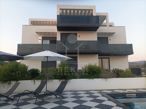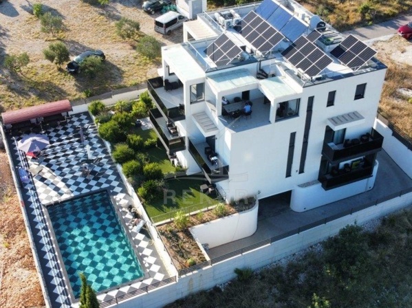Das Anwesen ist auf einem 800 m² großen Grundstück platziert und bietet eine herrliche Aussicht dank der Ausrichtung nach Süden und Westen. Die Steinmauer in Kombination mit einem Sichtschutzzaun sorgt für Privatsphäre, während die mediterrane Bepflanzung und automatische Bewässerungsanlage dem Anwesen eine charmante Atmosphäre verleiht. Das Gebäude erstreckt sich über 3 Etagen mit einer Gesamtfläche von 791 m² und ist ein Neubau mit hochwertigen Annehmlichkeiten wie einer Alarmanlage, einem Aufzug, einem Solarkraftwerk und Sonnenkollektoren für Warmwasser.