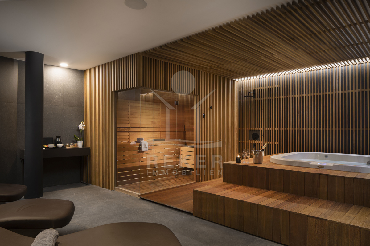 Im Untergeschoss der Wohnung finden Sie einen Fitnessraum, in dem Sie sich auspowern können, sowie eine Sauna und einen Jacuzzi für Momente der Entspannung und Entschleunigung. Ein moderner Weinkeller lädt für gesellige Stunden ein. Purer Luxus! Ein separater Trocken- und Waschraum sowie ein Abstellraum sorgen für zusätzlichen Komfort.