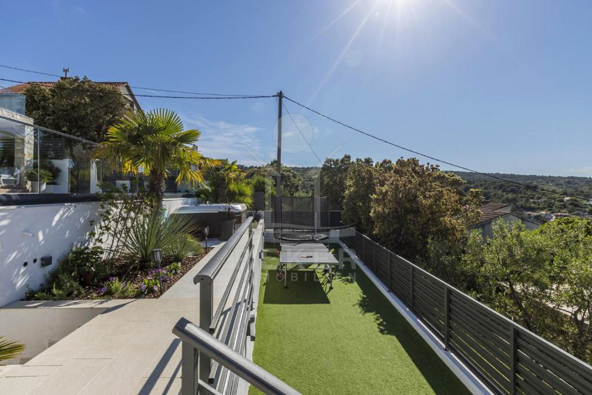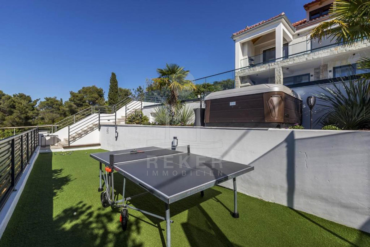 Die Außenanlage dieser Luxusvilla ist wie geschaffen für puren Genuss und Entspannung. Ein Highlight ist der 30 m² große, beheizte Pool mit einem Hydromassagesystem, umgeben von Liegestühlen auf dem Sonnendeck. Ein Whirlpool und eine Außendusche bieten weitere Entspannungsmöglichkeiten. Für gesellige Abende gibt es eine voll ausgestattete Sommerküche mit traditionellem Grill und traumhaftem Blick auf das Meer. Ein Spielplatz mit Trampolin und Tischtennis sorgt für Spaß und Unterhaltung. Mit drei Außenparkplätzen ist auch für ausreichend Abstellmöglichkeiten für Ihre Fahrzeuge gesorgt. Dies ist der perfekte Ort, um das Inselleben in vollen Zügen zu genießen und unvergessliche Momente zu erleben.