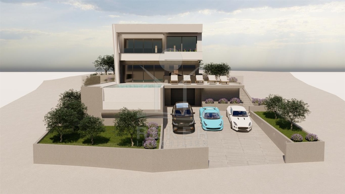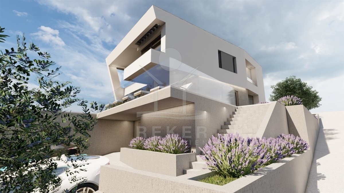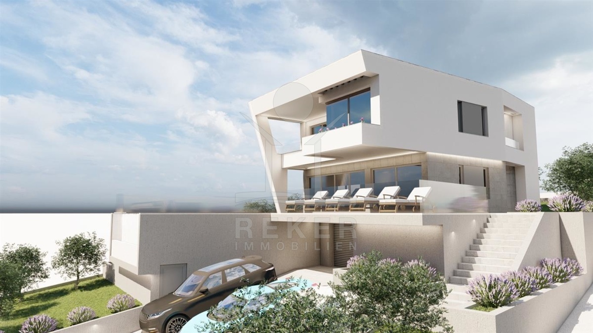 Das Anwesen liegt auf einem 910 m² großen Grundstück in Hanglage. Sie ist von wunderschönen kaskadenförmigen Gärten umgeben, die mit Olivenbäumen und dalmatinische Pflanzen bepflanzt wird. Das Gebäude erstreckt sich über 3 Etagen und verfügt über eine Wohnfläche von 320 m². Die Bauarbeiten und Fertigstellung sind voraussichtlich Sommer 2024 abgeschlossen. Das Haus ist mit einem Untergeschoss ausgestattet und bietet zusätzliche Räume sowie einen Wellness- und Fitnessbereich.