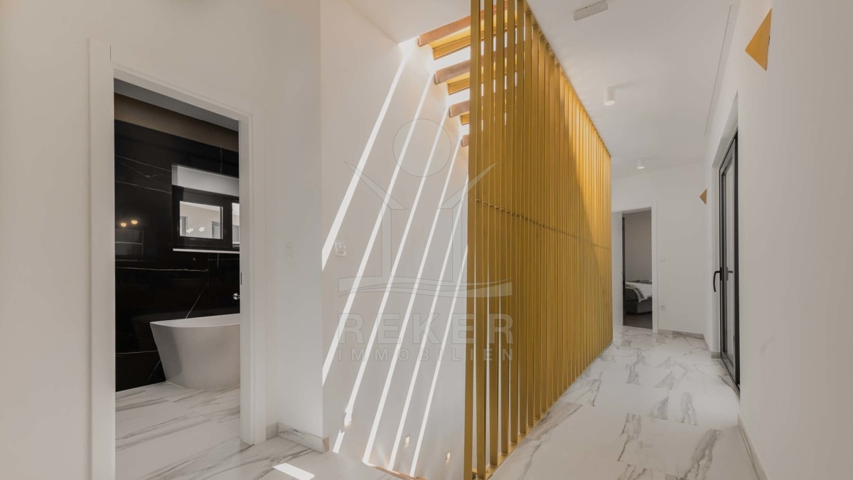 Im 1. Obergeschoss befinden sich drei großzügige Schlafzimmer, jeder mit eigenem Bad, für unvergleichlichen Komfort. Eine Treppe führt Sie auf die möblierte Dachterrasse mit atemberaubenden Ausblicken und unzähligen Gestaltungsmöglichkeiten für Ihre Freizeit.