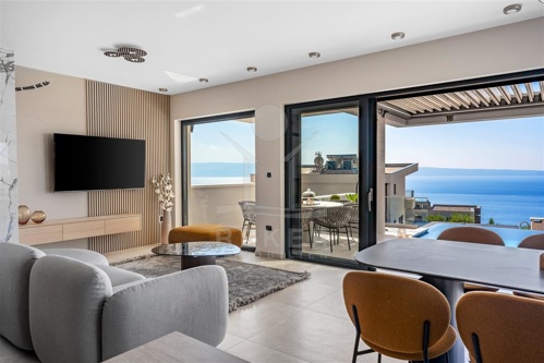 Das Treppenhaus im Inneren des Gebäudes ist mit Stein und einer integrierten LED-Beleuchtung gestaltet und verfügt über ein elegantes Glasgeländer, das den Luxus betont. Im 1. und 2. Stock befinden sich geräumige und komfortable Schlafzimmer, jeweils mit eigenem Bad. Eine großzügige Loggia erstreckt sich weiter in Richtung Süden und bietet einen wunderschönen Panoramablick auf das Meer und die Bucht. Auf dieser Etage gibt es auch ein drittes komfortables Schlafzimmer mit eigenem Bad und eine Loggia, die einen herrlichen Blick auf das Meer in östlicher Richtung bietet.