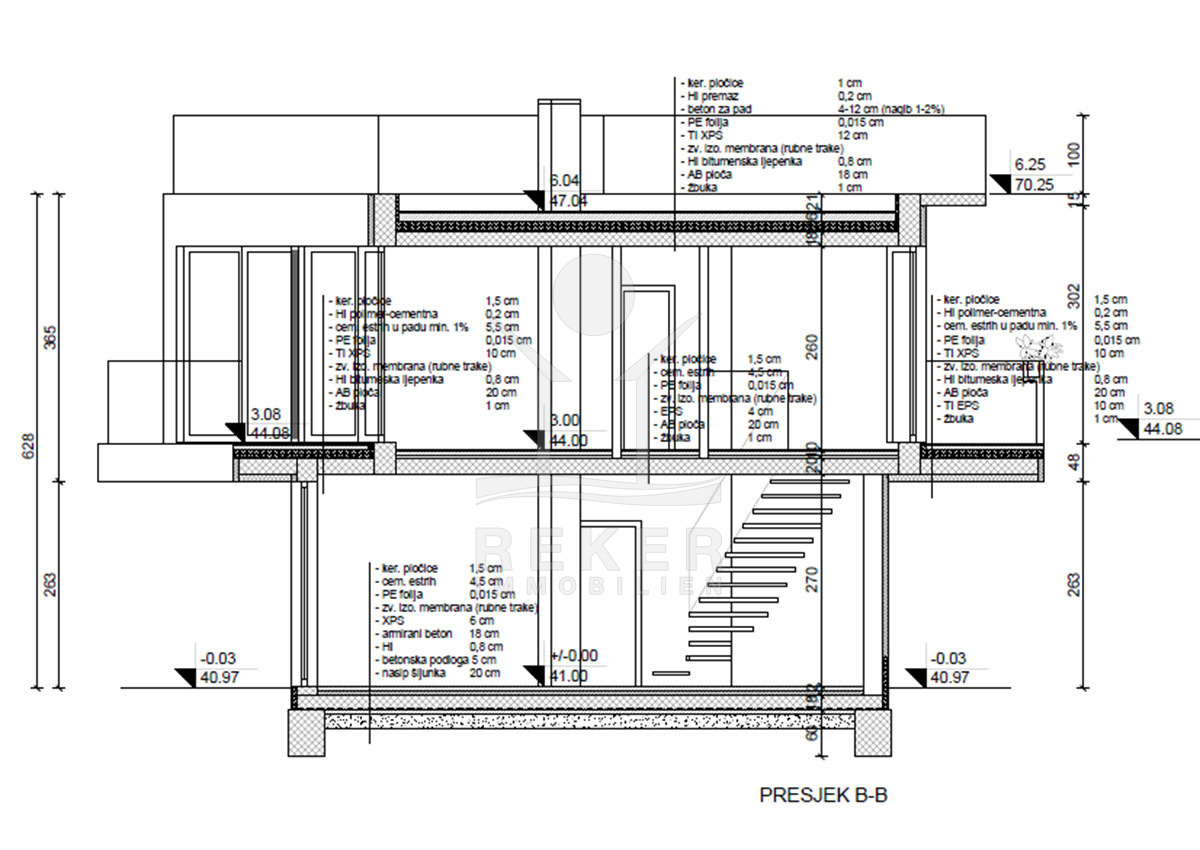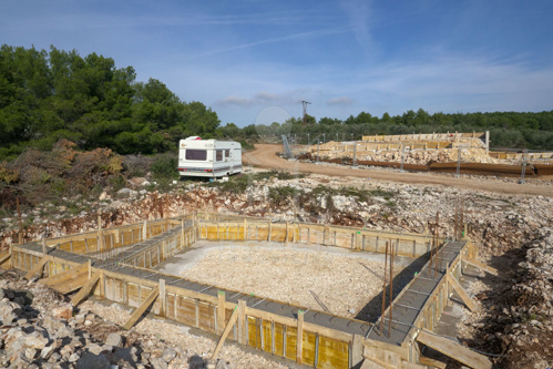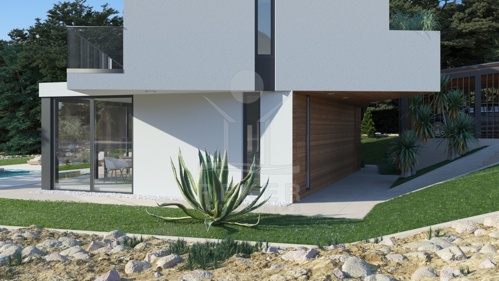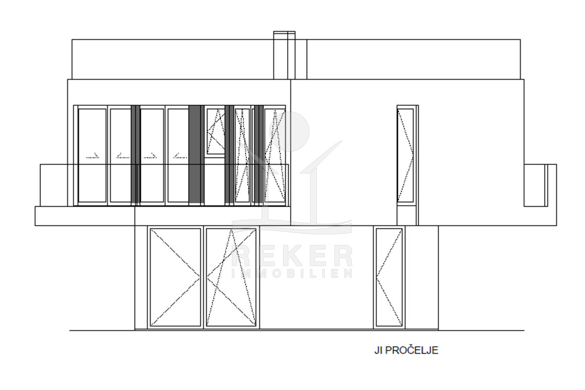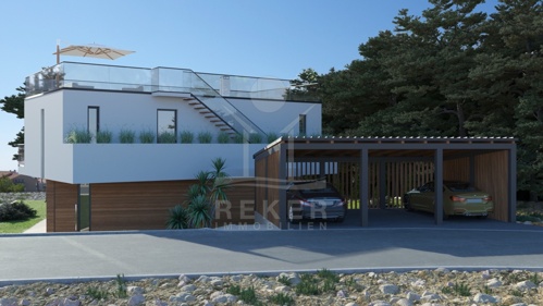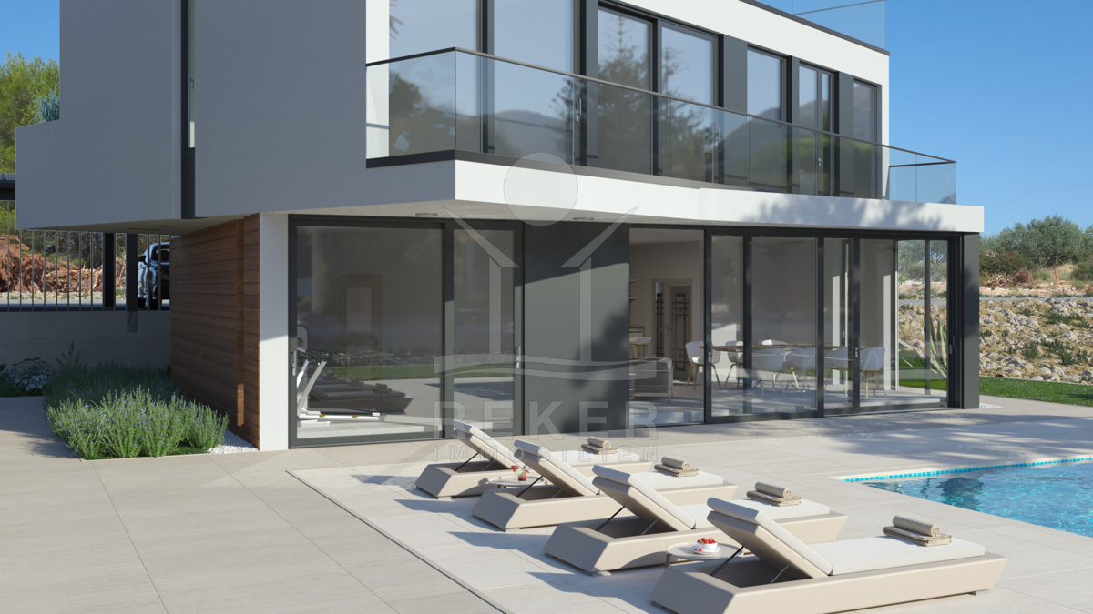 Die Außenbereiche der Villa werden zu einer wahren Oase der Erholung und Entspannung gestaltet. Der Swimmingpool und die überdachte Terrasse eignen sich ideal zum Entspannen und bieten gleichzeitig Platz für gesellige Zusammenkünfte. Darüber hinaus wird auf der Nordseite des ersten Stocks ein weiterer großer Balkon errichtet, von dem aus eine Außentreppe zur Dachterrasse führt, die einen herrlichen Blick auf das Meer und die umliegende Landschaft bietet. Mit mehreren Parkplätzen, einschließlich überdachter Optionen, ist diese Villa ein Ort, an dem man bleiben und das mediterrane Küstenleben in vollen Zügen genießen möchte.