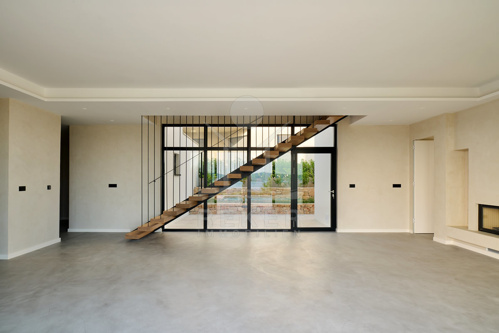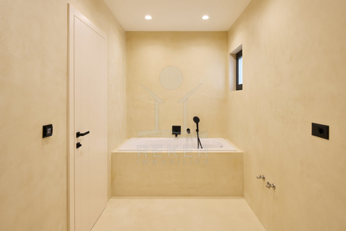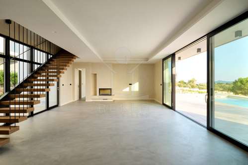 Die Villa besticht durch eine großzügige und luftige Innenraumaufteilung. Im Erdgeschoss erwartet Sie ein offener Wohn-, Ess- und Küchenbereich mit einer großflächigen Gestaltung sowie Zugang zur Terrasse und zum Poolbereich. Ein Gäste-WC, Dusch- und Umkleideraum, Wellnessbereich mit Sauna, Fitnessraum und Speisekammer runden das Angebot ab.