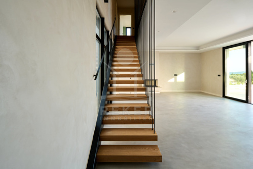 Über eine moderne Treppe gelangen Sie in den ersten Stock, der ein Hauptschlafzimmer mit Bad und begehbarem Kleiderschrank, zwei weitere Schlafzimmer, zwei Bäder und zugängliche Balkone (12,14 m²) mit atemberaubendem Meerblick und Blick auf die Umgebung bietet.