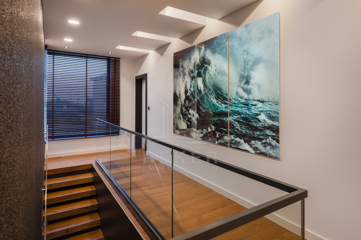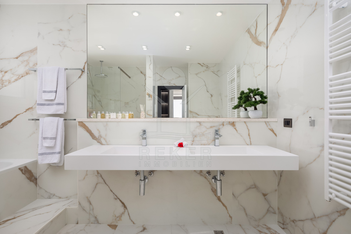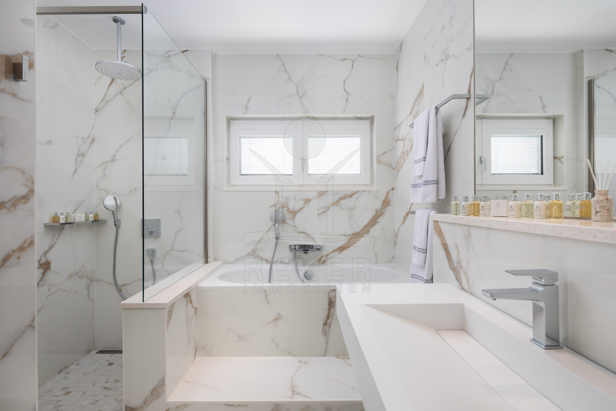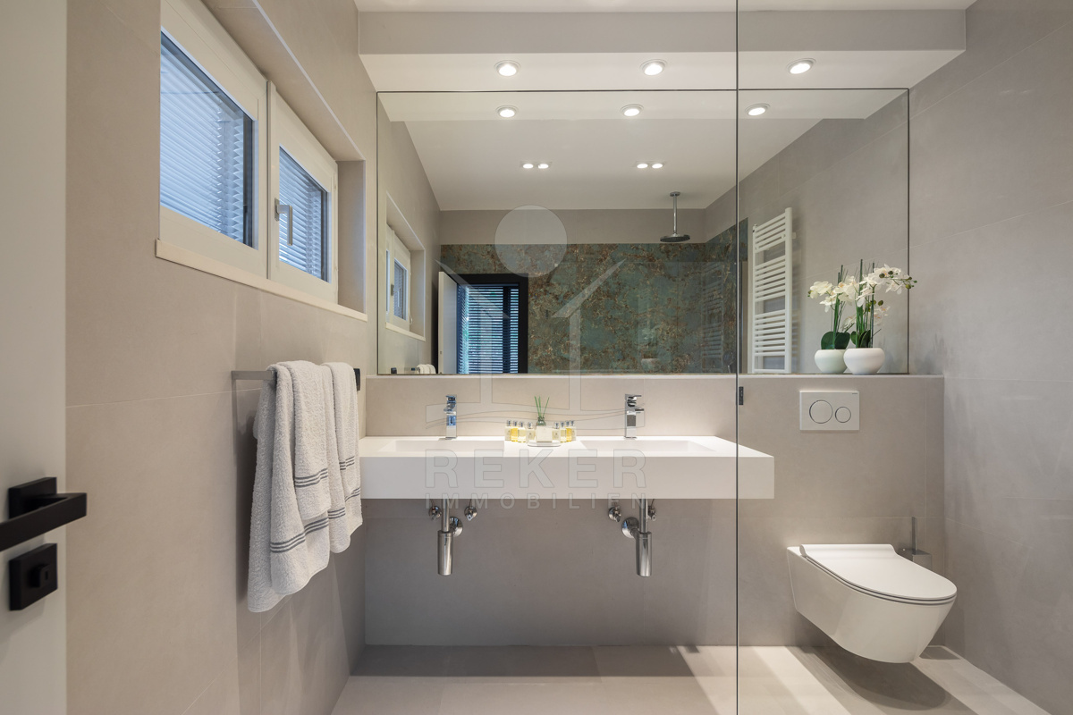 Im Obergeschoss stehen vier großzügige Schlafzimmer zur Verfügung, jeweils mit eigenem Bad. Zwei Bäder sind mit fernbedienbaren VELUX-Dachfenstern und Zwangsbelüftung ausgestattet. Alle Bäder sowie das zusätzliche WC verfügen über hochwertige italienische Fliesen, Glas- und Edelstahlelemente sowie Marken wie Hansgrohe, Ulisse, Duka, Geberit, Catalano und Titan. Eine vorbereitete Saunazone mit ca. 4 m² ergänzt den Wellnessbereich.