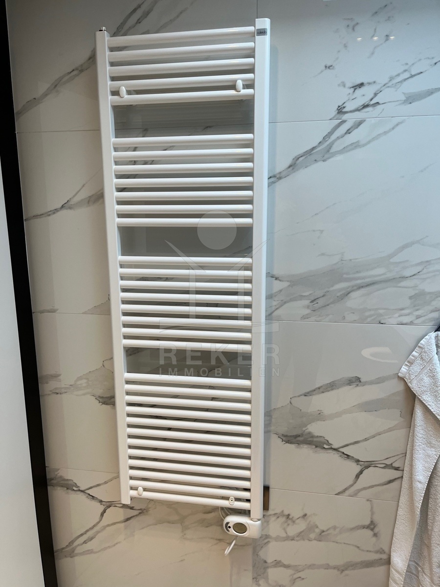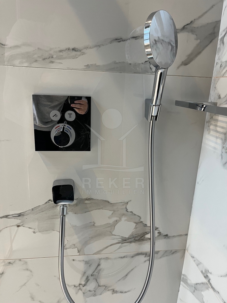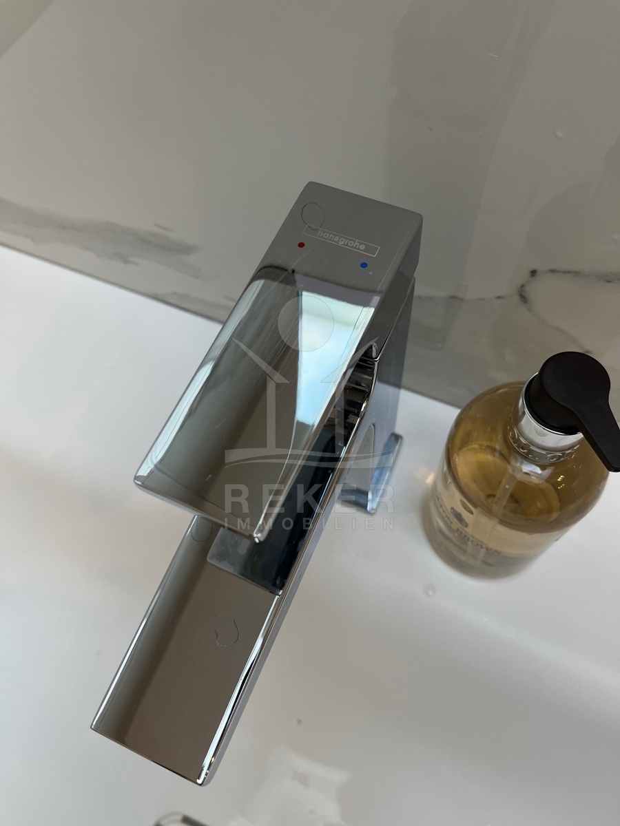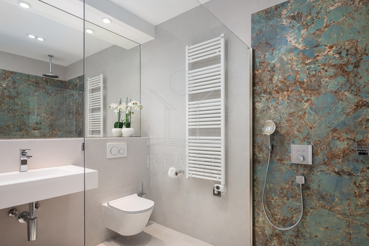 Im Obergeschoss stehen vier großzügige Schlafzimmer zur Verfügung, jeweils mit eigenem Bad. Zwei Bäder sind mit fernbedienbaren VELUX-Dachfenstern und Zwangsbelüftung ausgestattet. Alle Bäder sowie das zusätzliche WC verfügen über hochwertige italienische Fliesen, Glas- und Edelstahlelemente sowie Marken wie Hansgrohe, Ulisse, Duka, Geberit, Catalano und Titan. Eine vorbereitete Saunazone mit ca. 4 m² ergänzt den Wellnessbereich.
