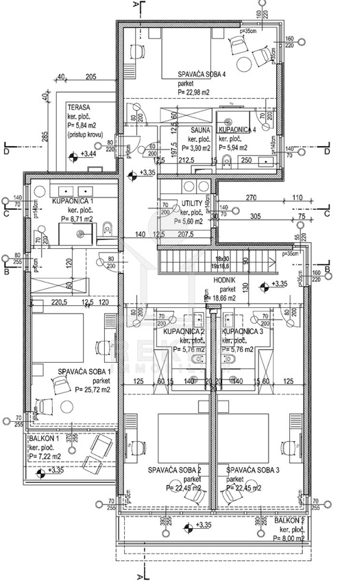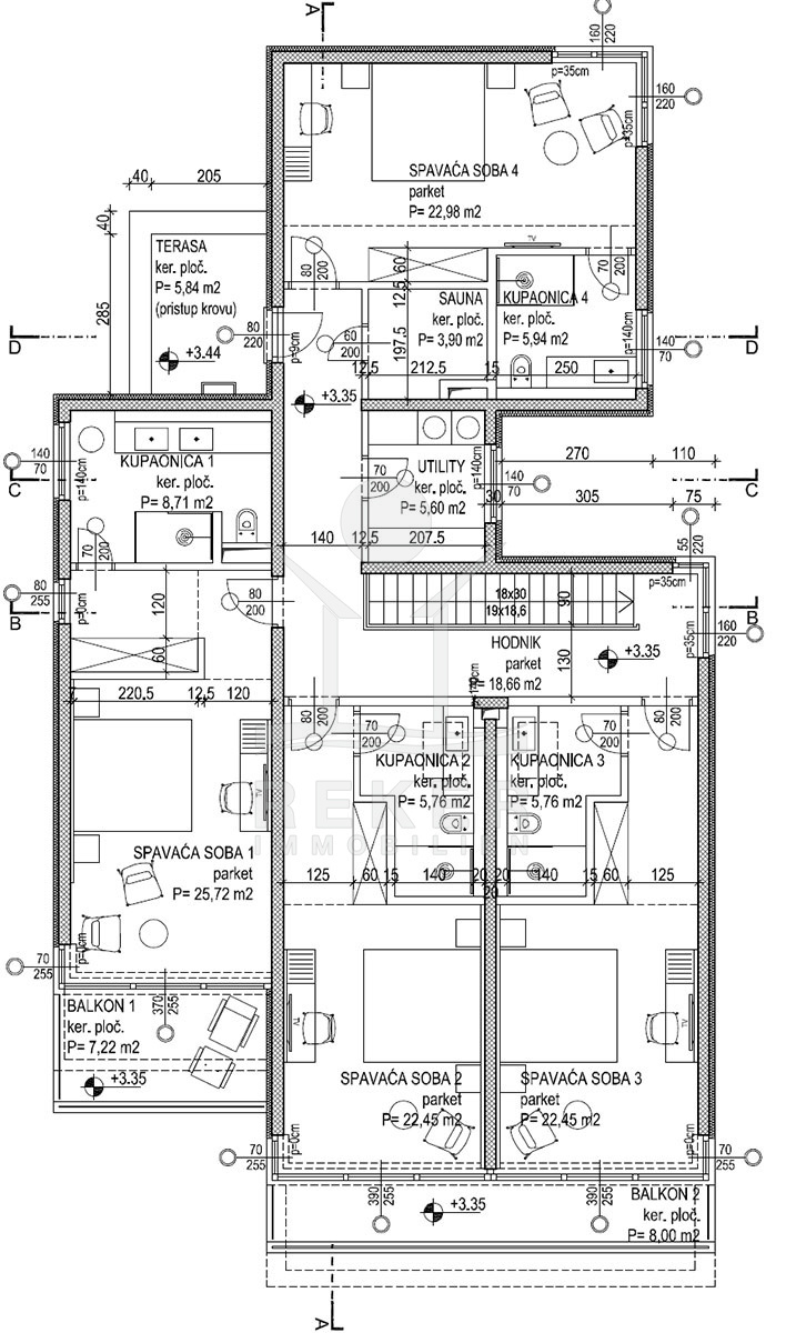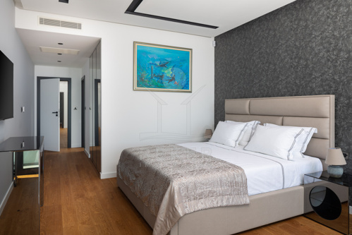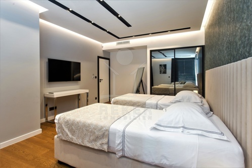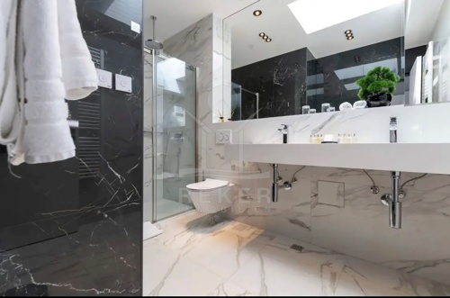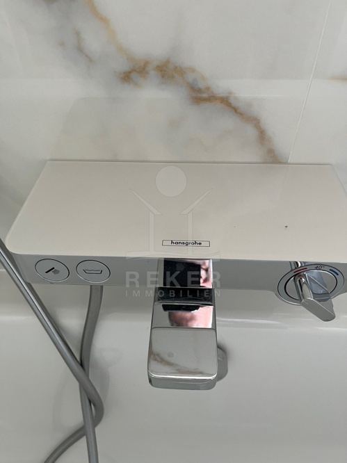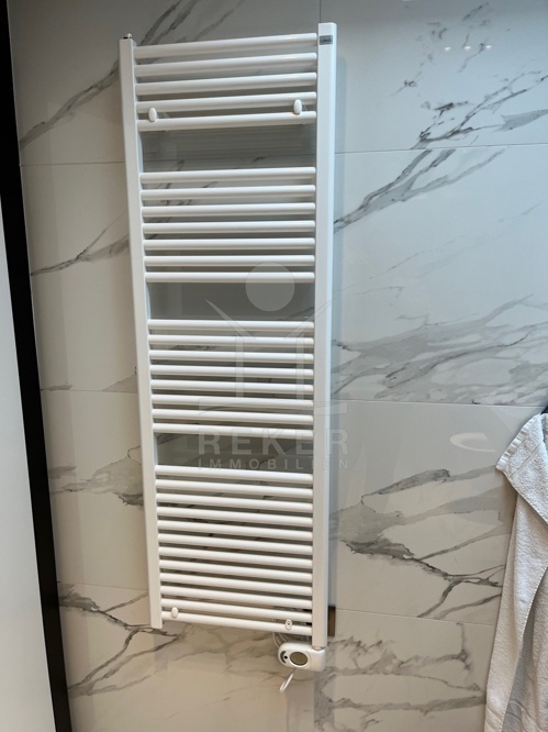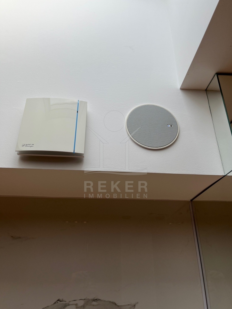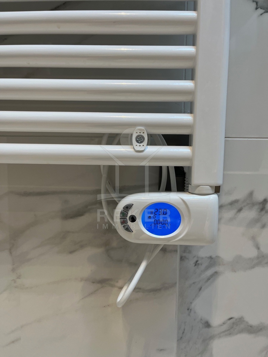 Im Obergeschoss stehen vier großzügige Schlafzimmer zur Verfügung, jeweils mit eigenem Bad. Zwei Bäder sind mit fernbedienbaren VELUX-Dachfenstern und Zwangsbelüftung ausgestattet. Alle Bäder sowie das zusätzliche WC verfügen über hochwertige italienische Fliesen, Glas- und Edelstahlelemente sowie Marken wie Hansgrohe, Ulisse, Duka, Geberit, Catalano und Titan. Eine vorbereitete Saunazone mit ca. 4 m² ergänzt den Wellnessbereich.