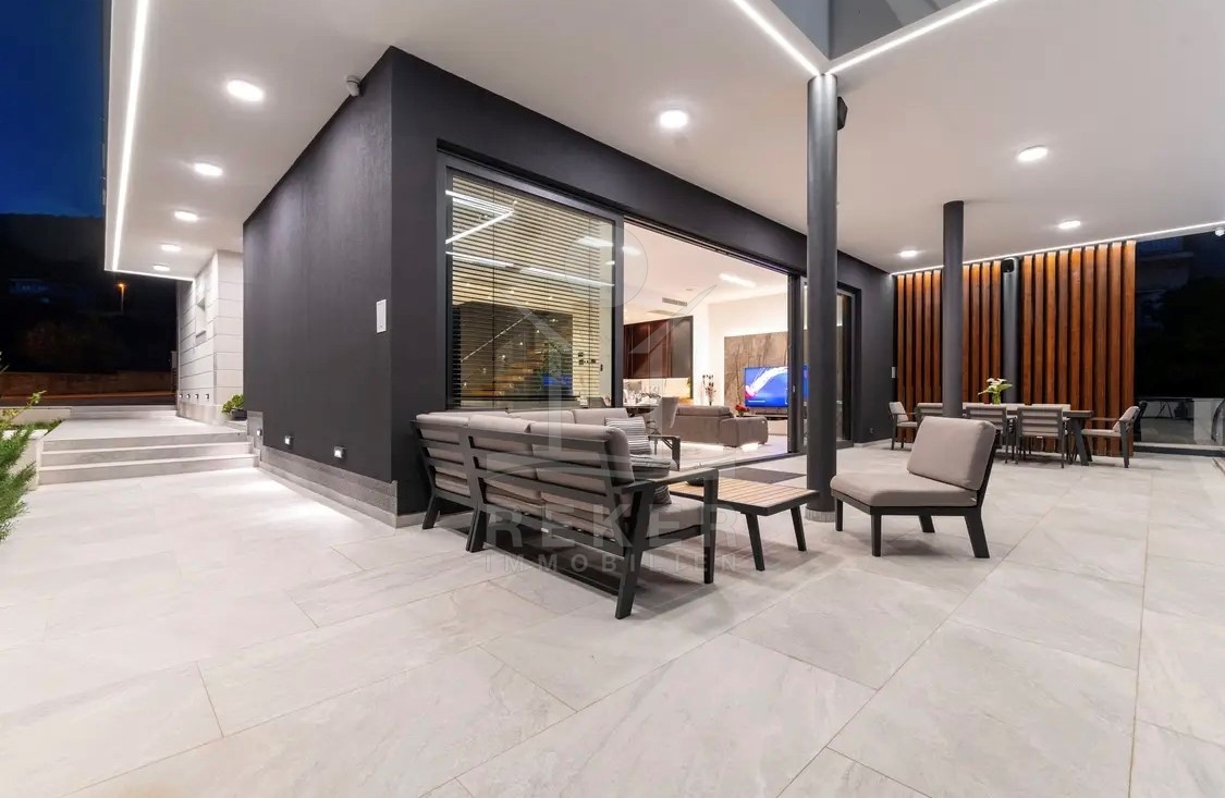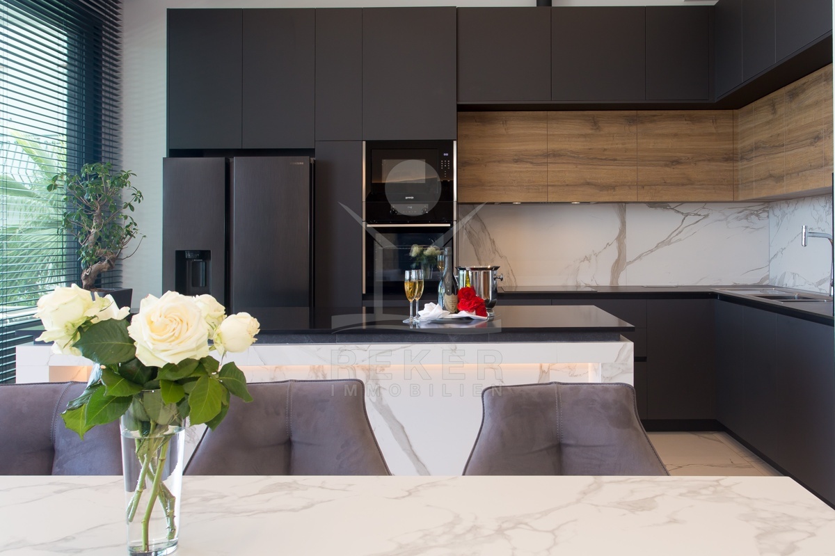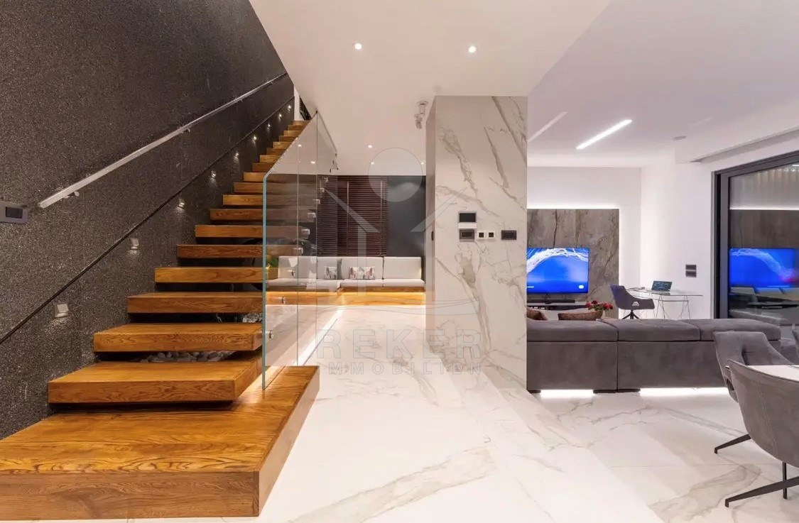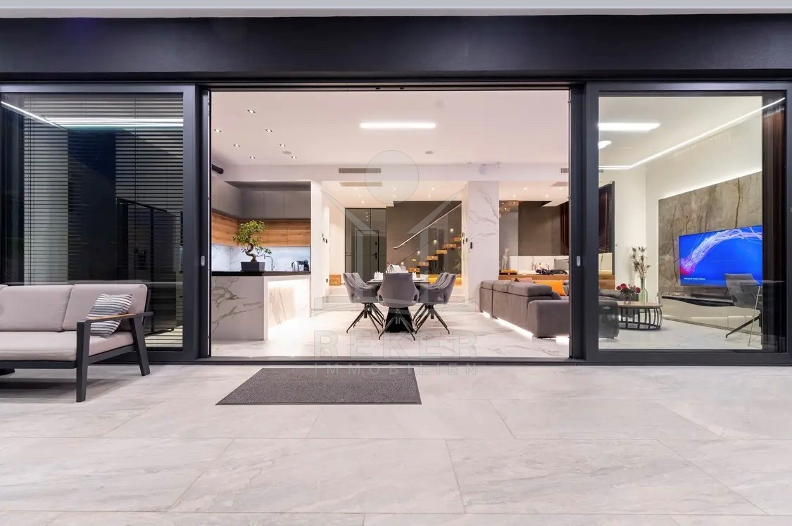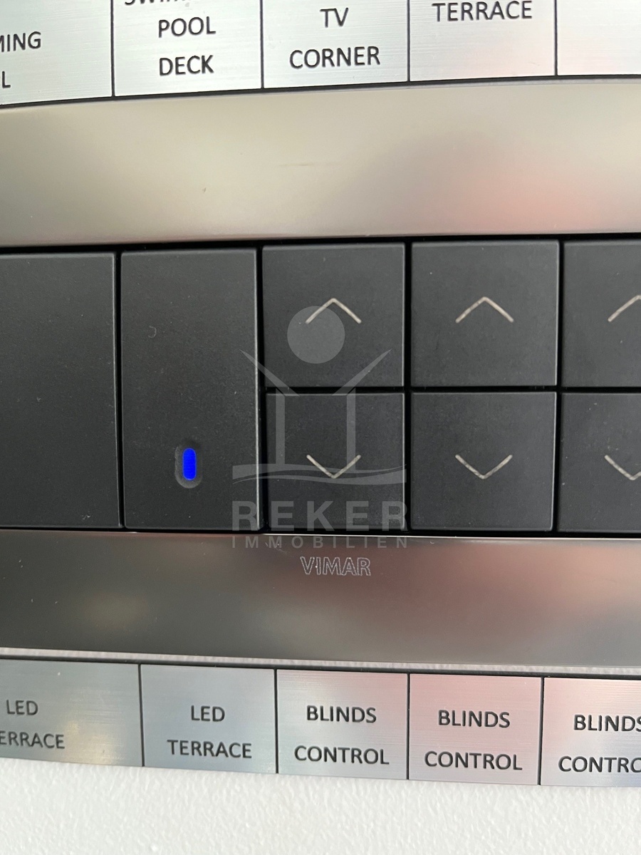 Die Ausstattung ist durchgehend hochwertig ausgeführt. Im Erdgeschoss wurden großformatige italienische Feinsteinzeugfliesen verlegt, im Obergeschoss 10 mm starkes Eichenparkett. Garage und Technikräume sind mit 600 × 600 × 15 mm Porzellanfliesen ausgestattet. Die Küche ist vollständig eingerichtet und umfasst Geräte von Gorenje, Bosch, Samsung, Caso Design, Juha und Blanco sowie zwei Weinkühler. Warmweiße LED-Leuchten sorgen innen und außen für ein stimmiges Lichtkonzept, gesteuert über VIMAR-Taster mit Dimmfunktion. Weitere Ausstattungsmerkmale sind die INOTHERM-Hauseingangstür mit Code, überwiegend elektrifizierte Fensterläden, PRIMA-Innentüren, eine Design-Pivot-Tür von CASA SOLIS, eine programmierbare Fußbodenheizung im Wohn- und Küchenbereich, ein Multiroom-Audiosystem von KB Sound, stabiler WLAN-Empfang im Haus, auf den Terrassen und am Pool über zwei Repeater sowie Festnetz-Internet und eine HD-TV-Antenne.