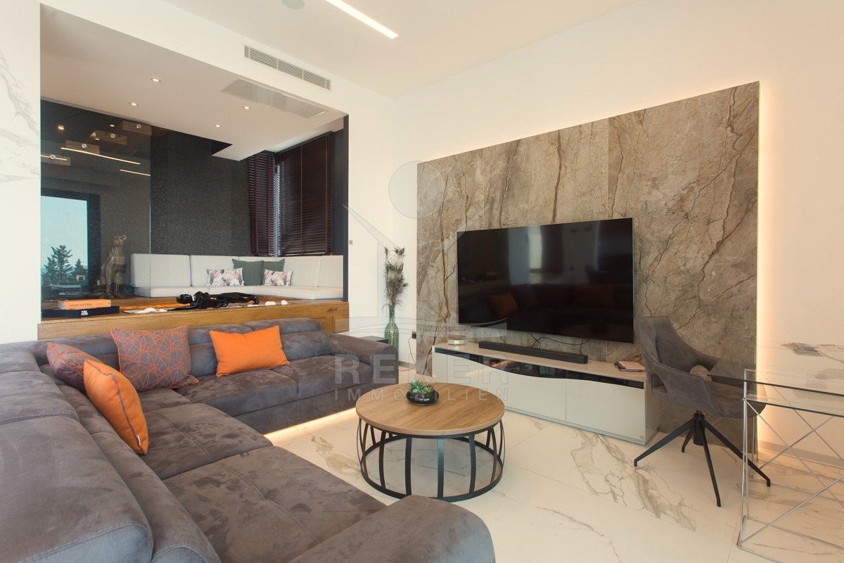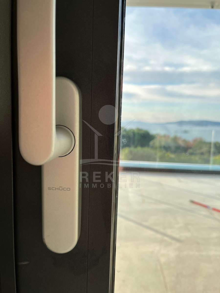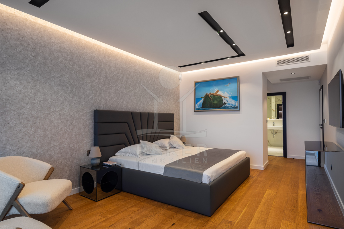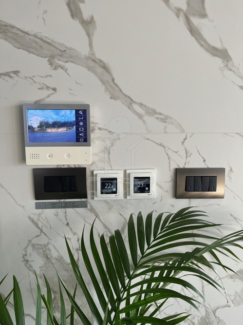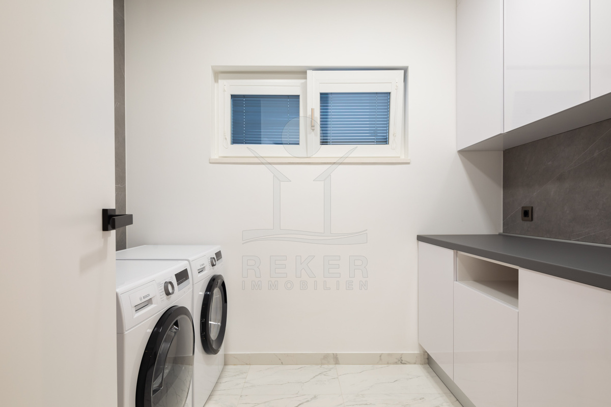 Die Ausstattung ist durchgehend hochwertig ausgeführt. Im Erdgeschoss wurden großformatige italienische Feinsteinzeugfliesen verlegt, im Obergeschoss 10 mm starkes Eichenparkett. Garage und Technikräume sind mit 600 × 600 × 15 mm Porzellanfliesen ausgestattet. Die Küche ist vollständig eingerichtet und umfasst Geräte von Gorenje, Bosch, Samsung, Caso Design, Juha und Blanco sowie zwei Weinkühler. Warmweiße LED-Leuchten sorgen innen und außen für ein stimmiges Lichtkonzept, gesteuert über VIMAR-Taster mit Dimmfunktion. Weitere Ausstattungsmerkmale sind die INOTHERM-Hauseingangstür mit Code, überwiegend elektrifizierte Fensterläden, PRIMA-Innentüren, eine Design-Pivot-Tür von CASA SOLIS, eine programmierbare Fußbodenheizung im Wohn- und Küchenbereich, ein Multiroom-Audiosystem von KB Sound, stabiler WLAN-Empfang im Haus, auf den Terrassen und am Pool über zwei Repeater sowie Festnetz-Internet und eine HD-TV-Antenne.