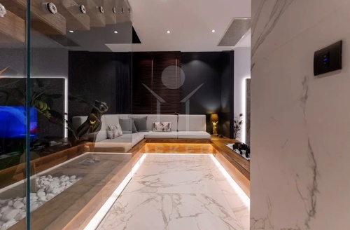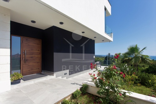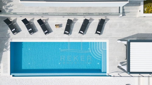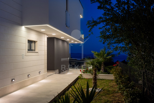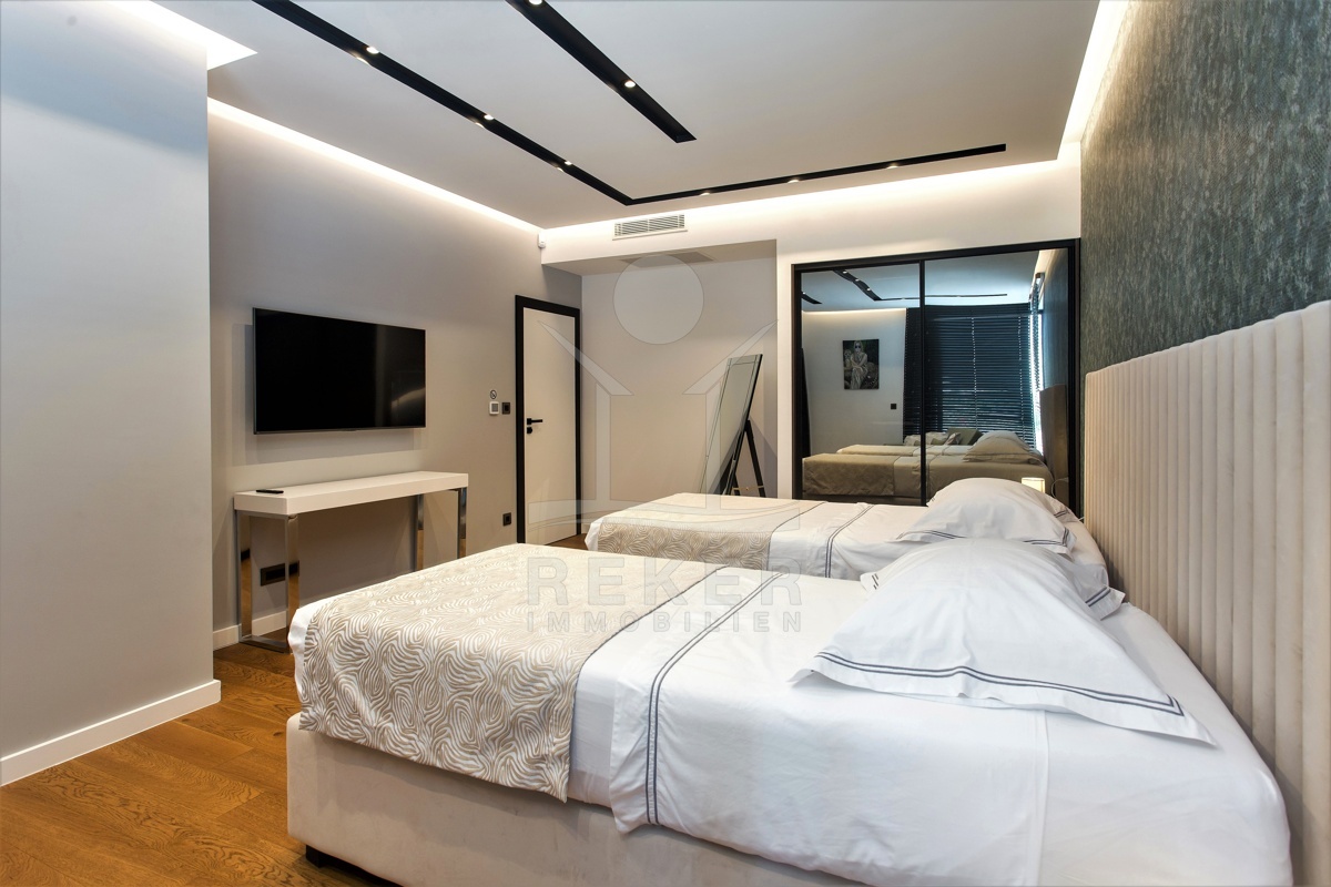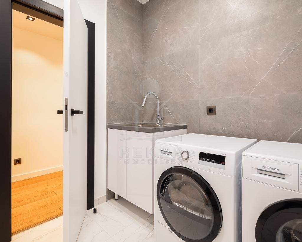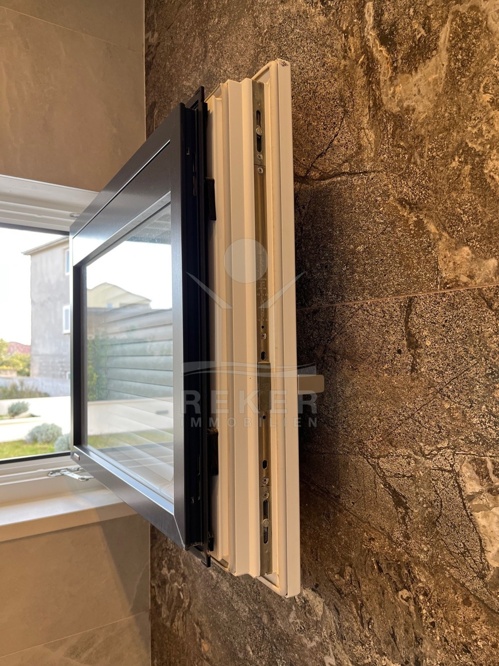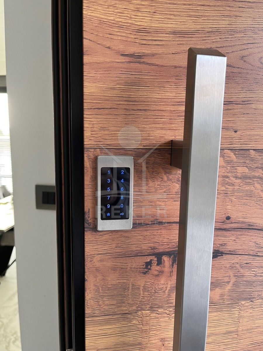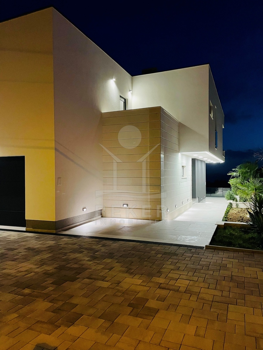 Die Ausstattung ist durchgehend hochwertig ausgeführt. Im Erdgeschoss wurden großformatige italienische Feinsteinzeugfliesen verlegt, im Obergeschoss 10 mm starkes Eichenparkett. Garage und Technikräume sind mit 600 × 600 × 15 mm Porzellanfliesen ausgestattet. Die Küche ist vollständig eingerichtet und umfasst Geräte von Gorenje, Bosch, Samsung, Caso Design, Juha und Blanco sowie zwei Weinkühler. Warmweiße LED-Leuchten sorgen innen und außen für ein stimmiges Lichtkonzept, gesteuert über VIMAR-Taster mit Dimmfunktion. Weitere Ausstattungsmerkmale sind die INOTHERM-Hauseingangstür mit Code, überwiegend elektrifizierte Fensterläden, PRIMA-Innentüren, eine Design-Pivot-Tür von CASA SOLIS, eine programmierbare Fußbodenheizung im Wohn- und Küchenbereich, ein Multiroom-Audiosystem von KB Sound, stabiler WLAN-Empfang im Haus, auf den Terrassen und am Pool über zwei Repeater sowie Festnetz-Internet und eine HD-TV-Antenne.