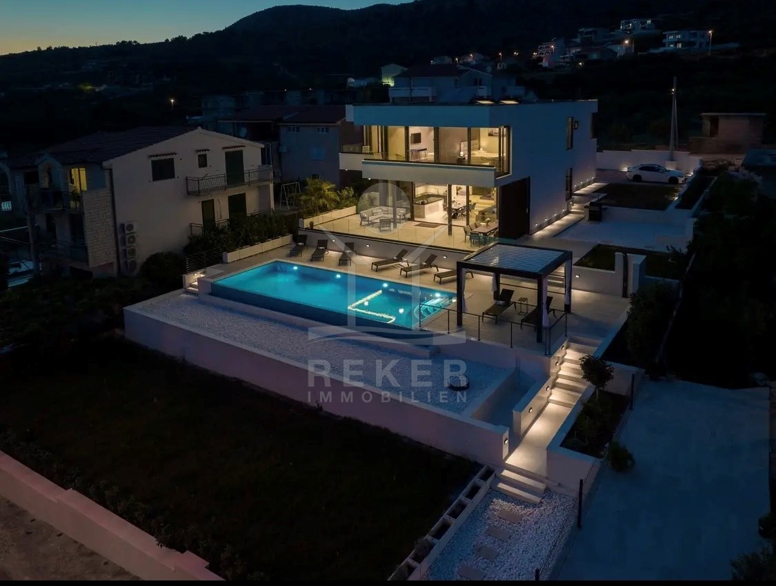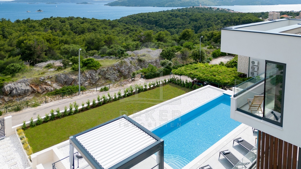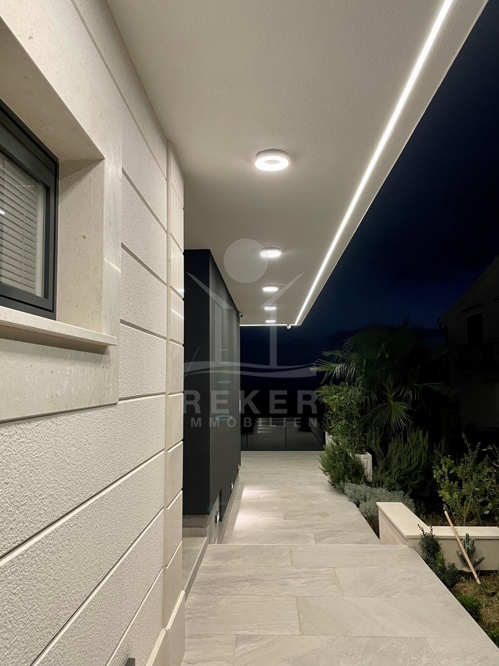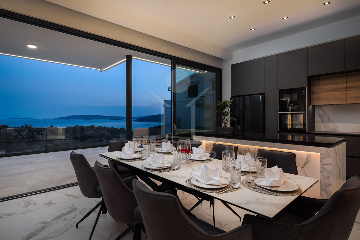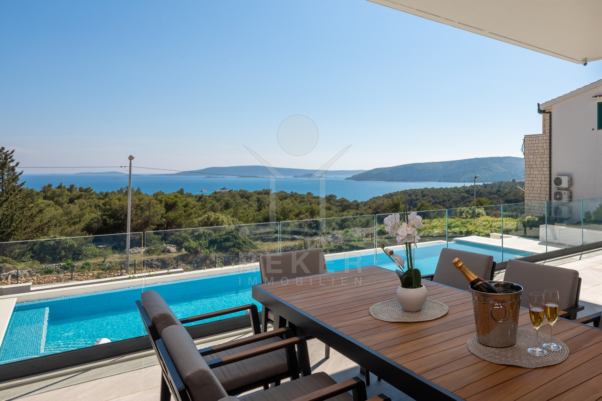 Die Villa befindet sich in ruhiger Höhenlage nahe Trogir in Dalmatien, am Ende einer Sackgasse mit sehr wenig Verkehr. Das sorgt für Privatsphäre und entspannte Abläufe. Der Flughafen Split ist ca. 10 km entfernt, die Stadt Split ca. 30 km. Richtung Westen erreichen Sie Rogoznica, Primošten, Šibenik sowie den Krka-Nationalpark im Umkreis bis 60 km. Zur Adria gehen Sie in etwa 10 Minuten durch den Wald, in der Nähe des Hotel Medena. Das Grundstück befindet sich rund 60 m über dem Meer und ist nach Süden ausgerichtet. Der Blick reicht über ein geschütztes Waldgebiet bis zur gegliederten Küste mit zahlreichen Inseln.