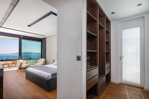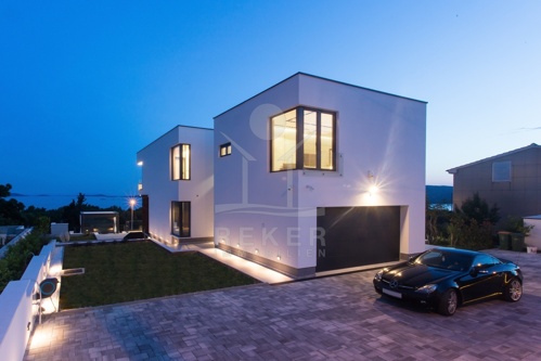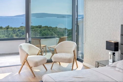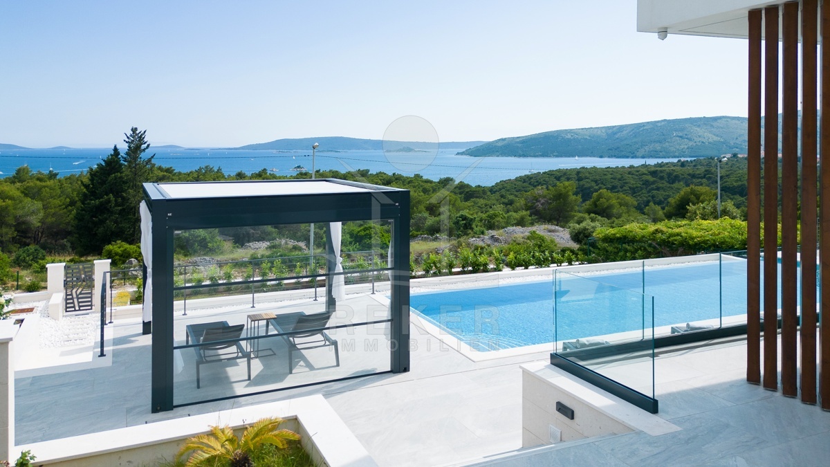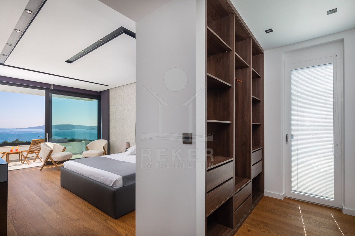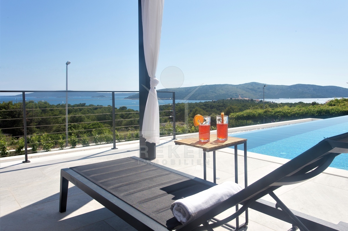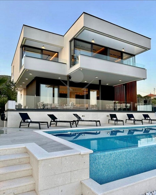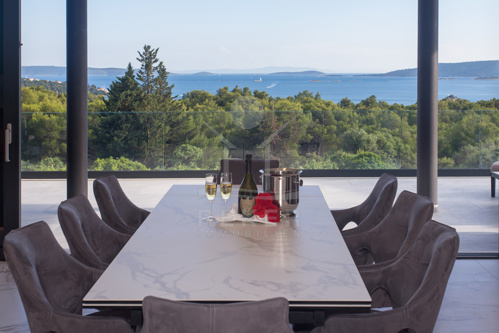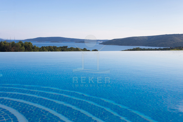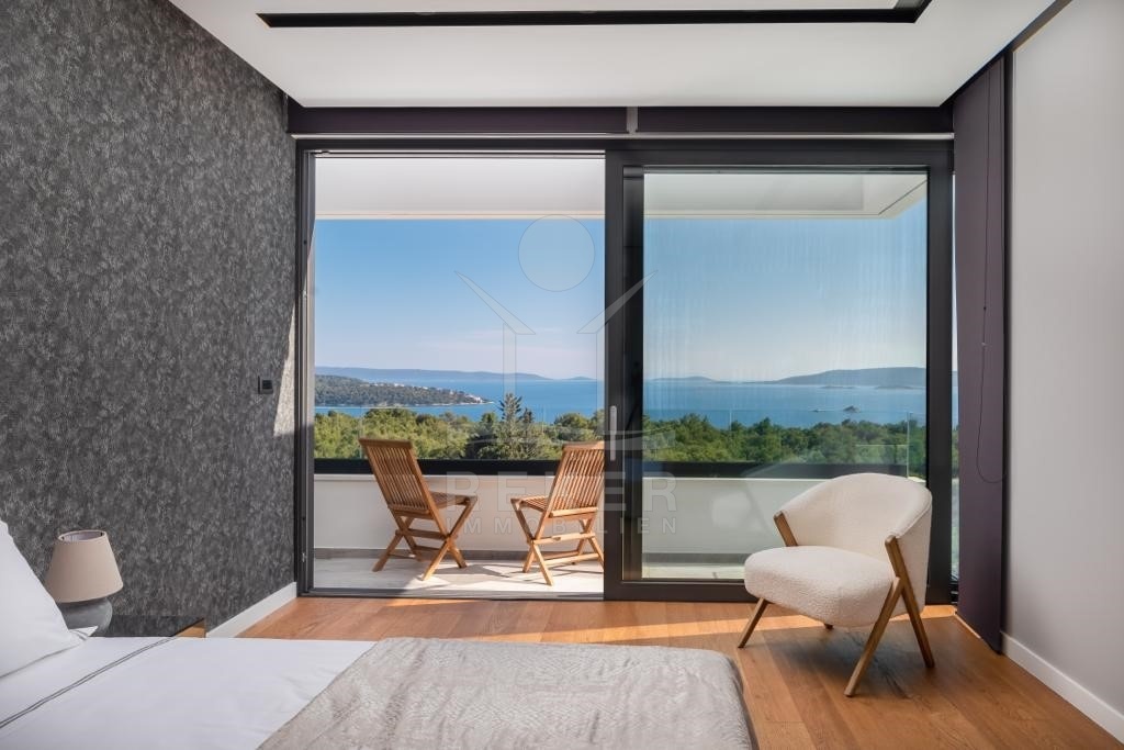 Die Villa befindet sich in ruhiger Höhenlage nahe Trogir in Dalmatien, am Ende einer Sackgasse mit sehr wenig Verkehr. Das sorgt für Privatsphäre und entspannte Abläufe. Der Flughafen Split ist ca. 10 km entfernt, die Stadt Split ca. 30 km. Richtung Westen erreichen Sie Rogoznica, Primošten, Šibenik sowie den Krka-Nationalpark im Umkreis bis 60 km. Zur Adria gehen Sie in etwa 10 Minuten durch den Wald, in der Nähe des Hotel Medena. Das Grundstück befindet sich rund 60 m über dem Meer und ist nach Süden ausgerichtet. Der Blick reicht über ein geschütztes Waldgebiet bis zur gegliederten Küste mit zahlreichen Inseln.