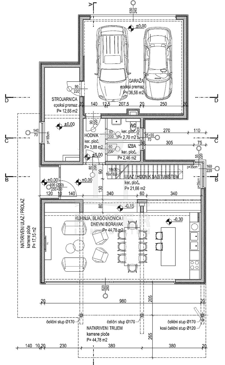 Die Bauweise ist auf Langlebigkeit und Energieeffizienz ausgelegt. Das Gebäude wurde vollständig aus hochdichtem Stahlbeton errichtet, mit Wandstärken über dem Standard von 200 mm. Die Abdichtung und Dämmung sind umfangreich ausgeführt. Fundamente mit moderner Abdichtung, Außenwände mit 100 mm Steinwolle und Silikonputz, Böden mit 150 bis 160 mm mehrlagiger Dämmung sowie ein Dach mit ca. 300 mm Dämmung, UV-Folie und abdeckendem Flusskies.