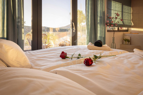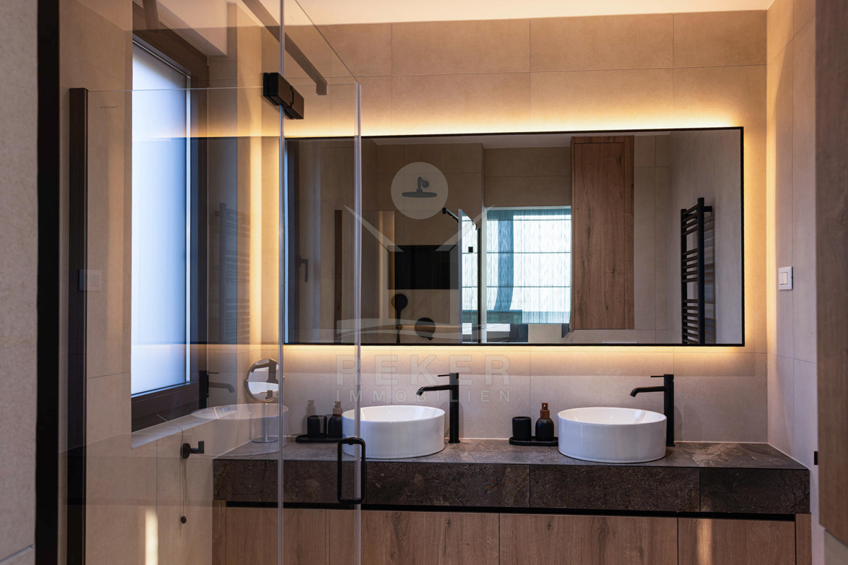 Die Innentreppe verbindet beide Etagen und führt Sie in den lichtdurchfluteten ersten Stock, der zwei Schlafzimmer mit eigenem Bad sowie ein zusätzliches Schlafzimmer und Badezimmer bietet. Die großen Glasfenster auf beiden Seiten der Wände schaffen eine helle und freundliche Atmosphäre, in der Sie sich rundum wohlfühlen können.