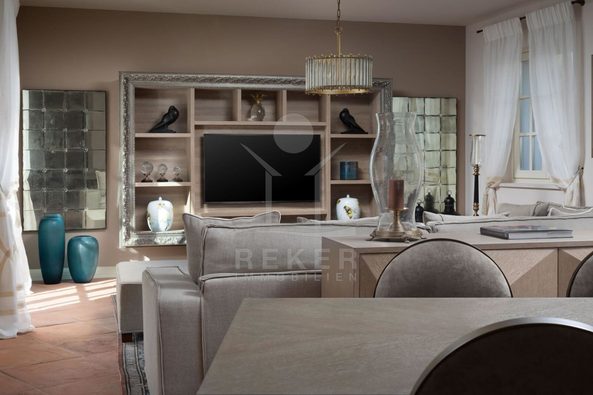 Die Wohnung beeindruckt durch ihre luxuriösen Ausstattungen und zugleich minimalistischen Designelemente. Im Erdgeschoss befinden sich eine moderne und edle Küche mit Essbereich sowie ein elegant eingerichtetes Wohnzimmer mit Designermöbeln. Ein geräumiges Schlafzimmer mit Badezimmer rundet das Erdgeschoss ab.