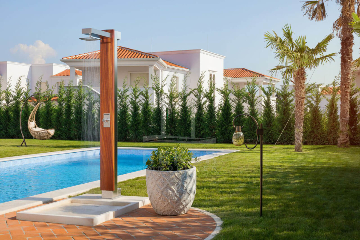 Das Highlight dieses Hauses ist definitiv die Terrasse mit einem großen, erfrischenden Pool, einer Außendusche, einem Sonnendeck mit Luxusliegen und einer überdachten Terrasse mit Möbeln. Dort können Sie Ihre Freunde oder Familie unterhalten oder einfach unter freiem Himmel entspannen. Diese fabelhafte Luxusvilla ist ein Zuhause, das wirklich das Beste aus Ihrer Lebensqualität herausholt.