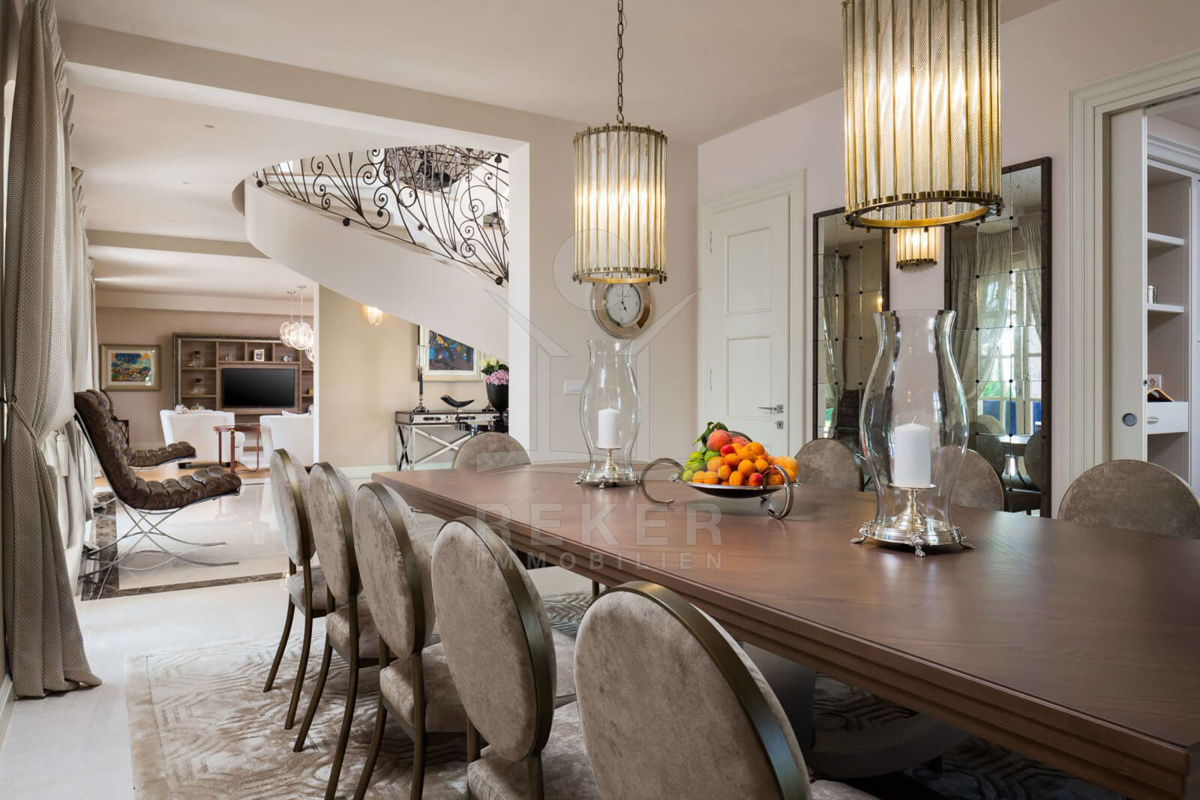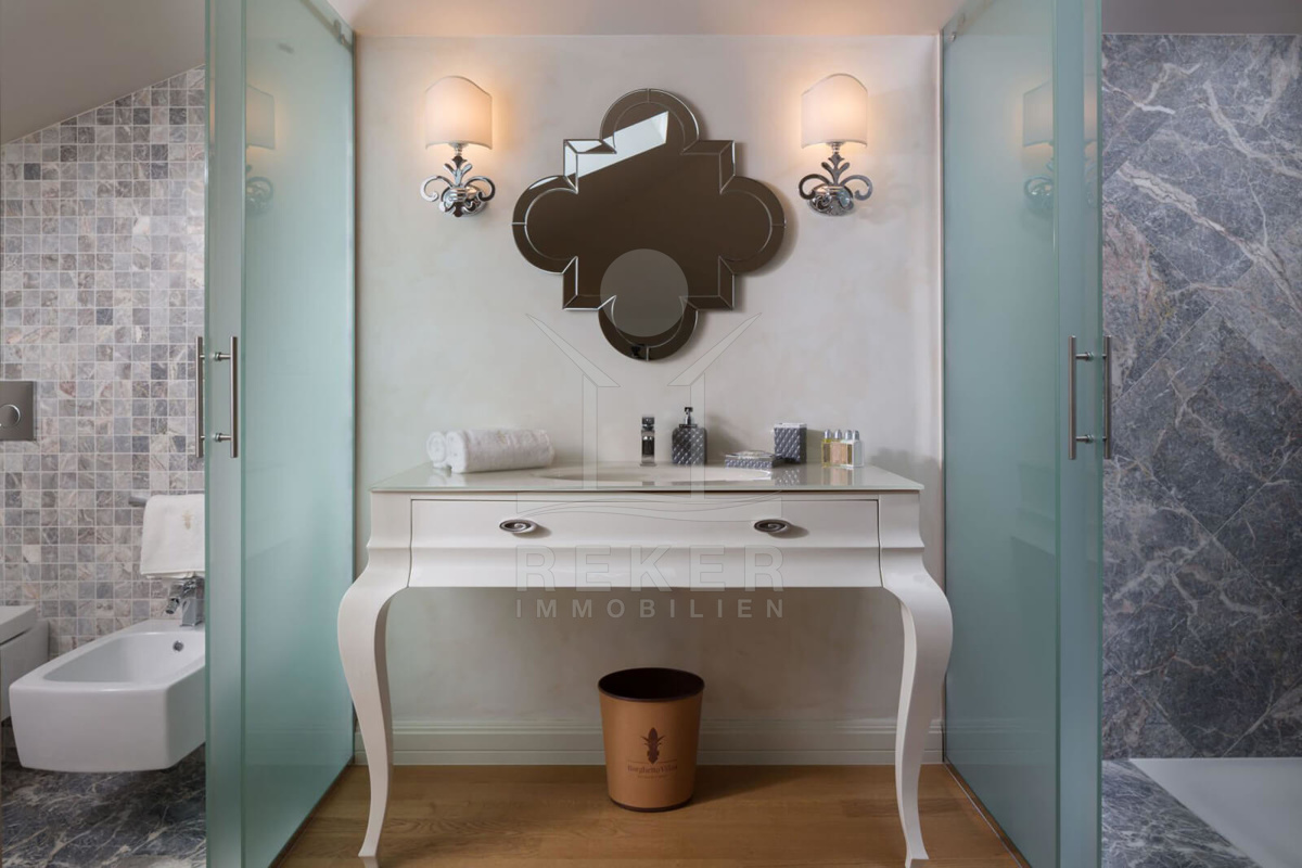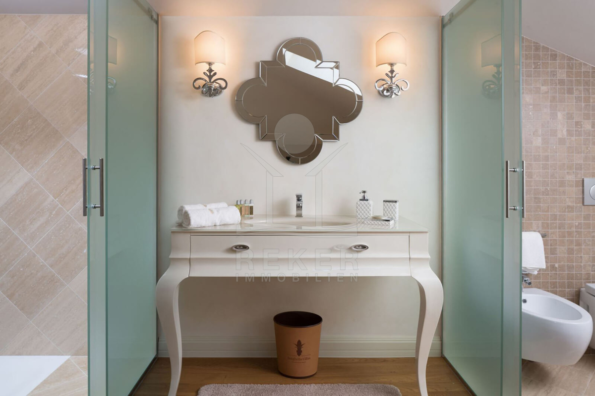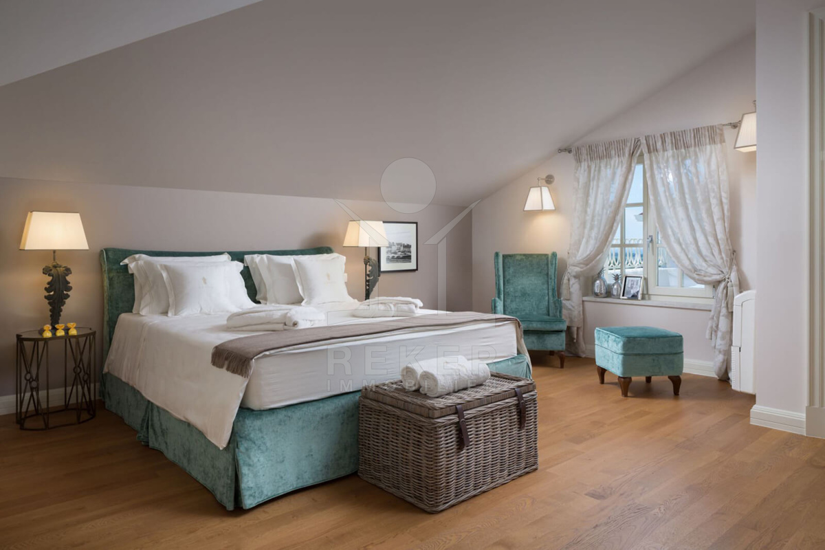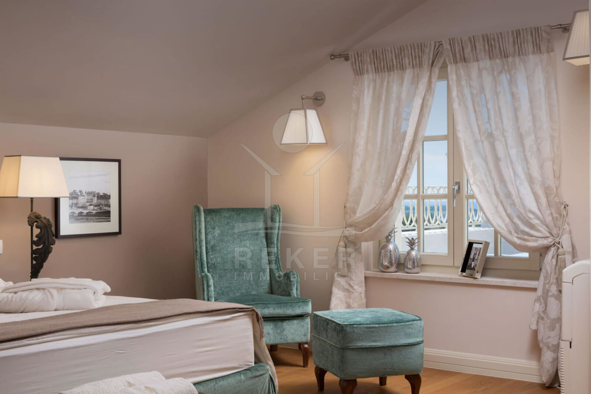 Eine beeindruckende Wendeltreppe und luxuriöse Kronleuchter verbinden die beiden Etagen. Im Obergeschoss befinden sich vier weitere Schlafzimmer, jeweils mit geräumigen, sorgfältig dekorierten Badezimmern. Der Höhepunkt der Wohnung ist die Dachterrasse mit einem atemberaubenden Ausblick auf die grünen Hügel von Novigrad bis Poreč. Hier können Sie entspannen und den Abend mit Freunden und Familie genießen.