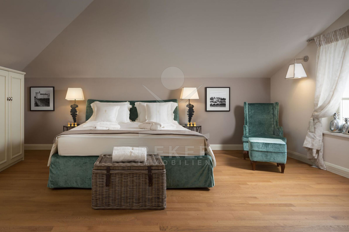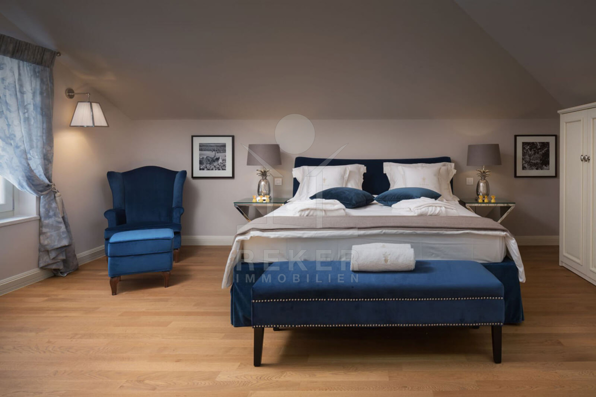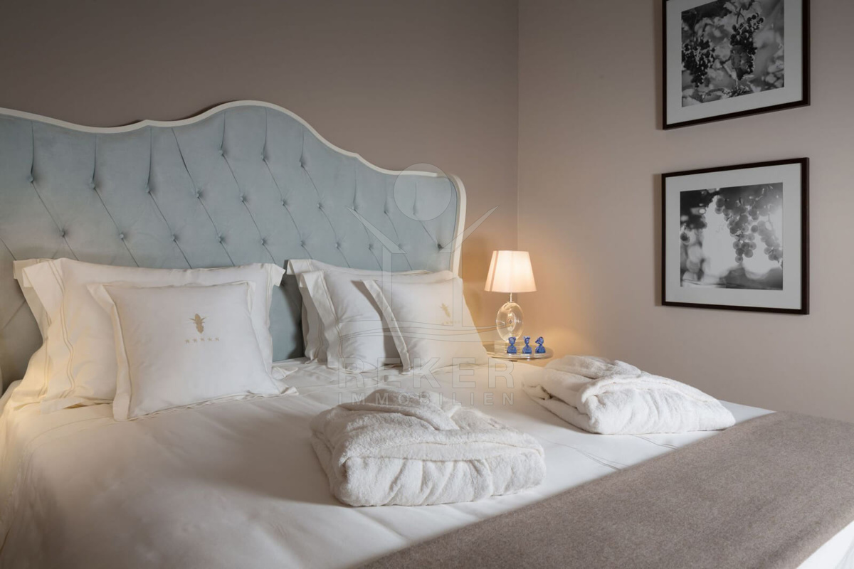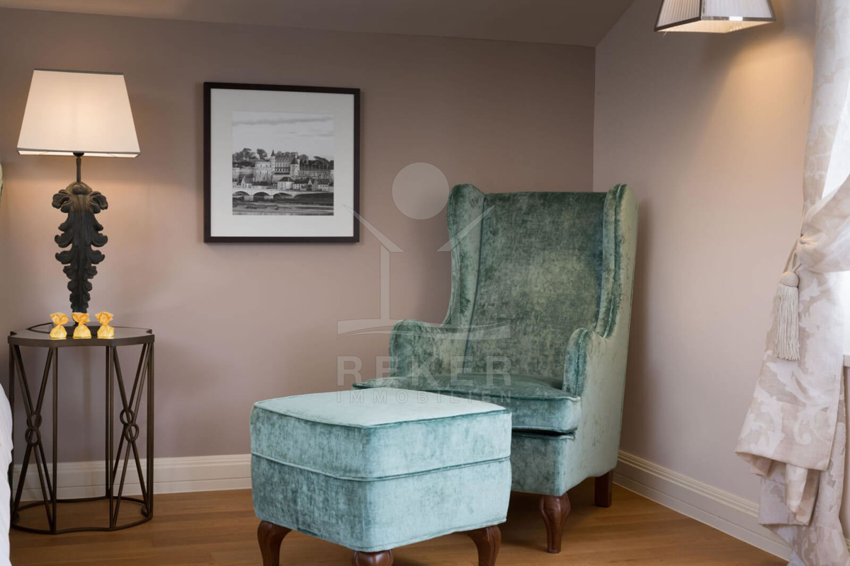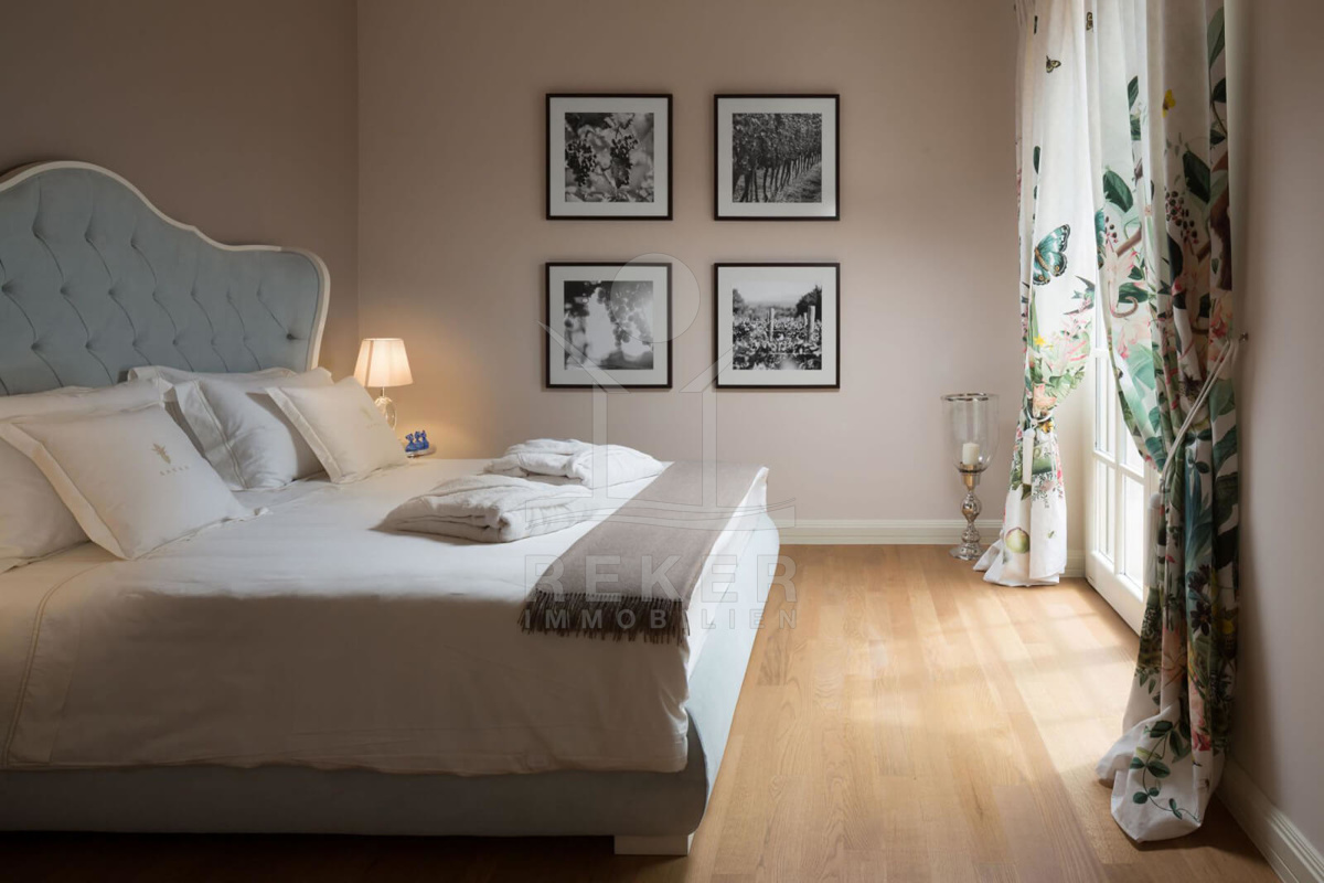 Eine beeindruckende Wendeltreppe und luxuriöse Kronleuchter verbinden die beiden Etagen. Im Obergeschoss befinden sich vier weitere Schlafzimmer, jeweils mit geräumigen, sorgfältig dekorierten Badezimmern. Der Höhepunkt der Wohnung ist die Dachterrasse mit einem atemberaubenden Ausblick auf die grünen Hügel von Novigrad bis Poreč. Hier können Sie entspannen und den Abend mit Freunden und Familie genießen.