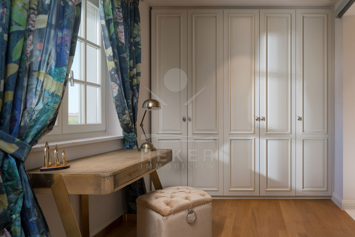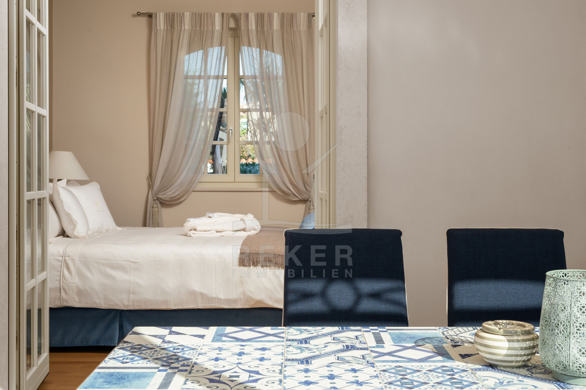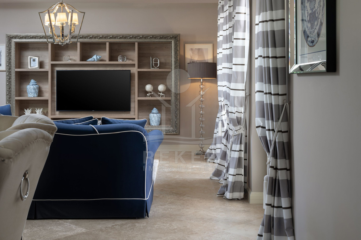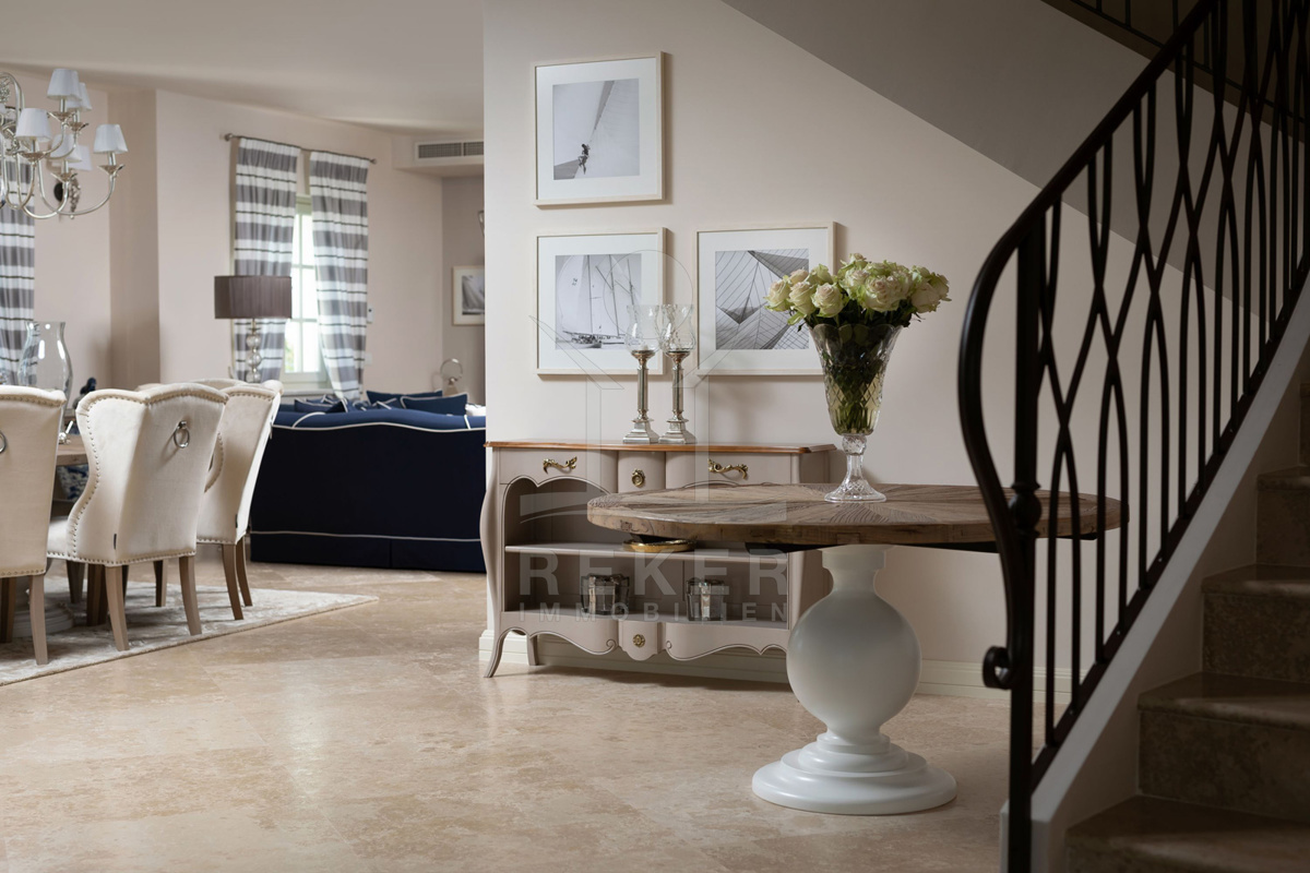 Die Villa wird vollständig mit einzigartigen Unikat-Möbelstücken verkauft, die perfekt aufeinander abgestimmt sind und eine besondere Atmosphäre schaffen. Im Erdgeschoss der Villa erwartet Sie ein offenes Raumkonzept, das eine moderne Küche, ein Esszimmer und ein Wohnzimmer miteinander verbindet. Eine überdachte Außenterrasse lädt zum Entspannen ein. Hier befinden sich auch ein Schlafzimmer mit eigenem Bad und ein Abstellraum.