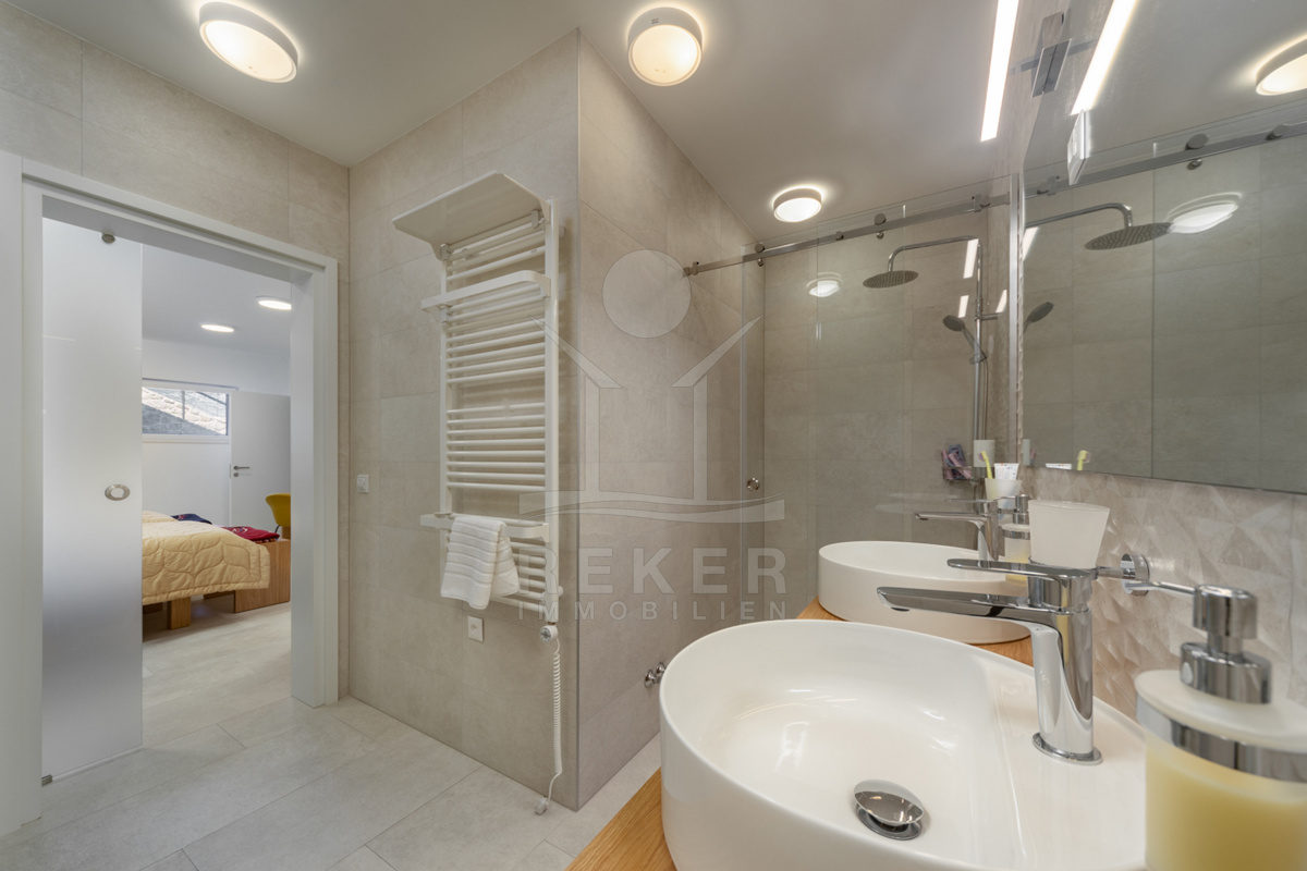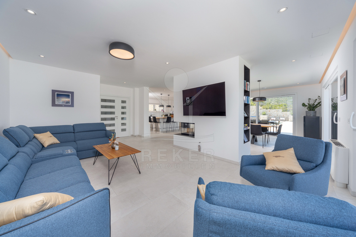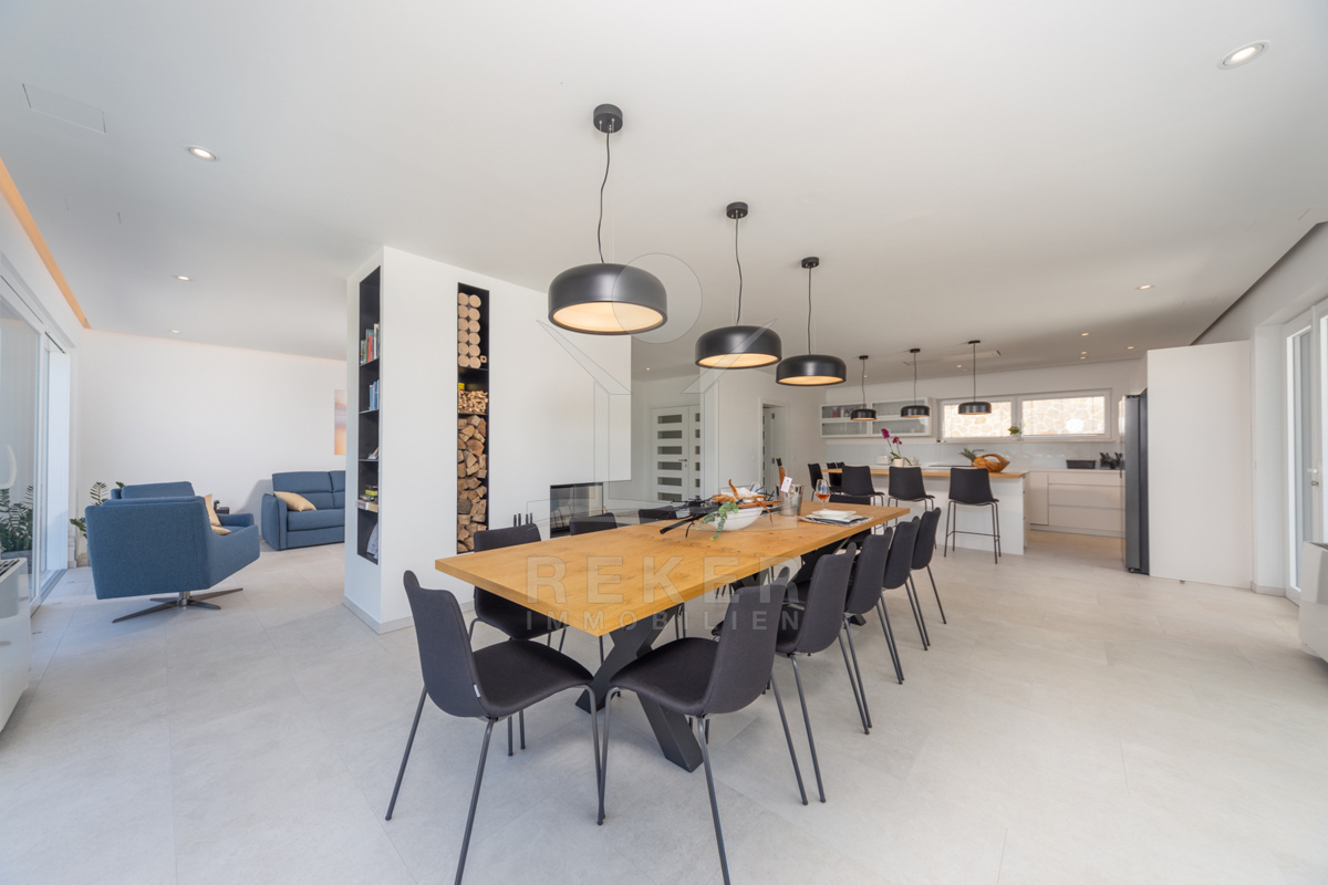 Die Wohnbereiche sind hochwertig eingerichtet, unter anderem mit Designermöbeln und Sofas von Natuzi. Ein dreiseitig verglaster Kamin trennt Ess- und Wohnzimmer und schafft in den Wintermonaten eine besondere Stimmung. Smarthome-Steuerung, Sicherheitsanlage mit Kameras, Internorm-Fenster mit 3‑fach-Verglasung und moderne Wärmepumpentechnik unterstreichen den hohen Standard.