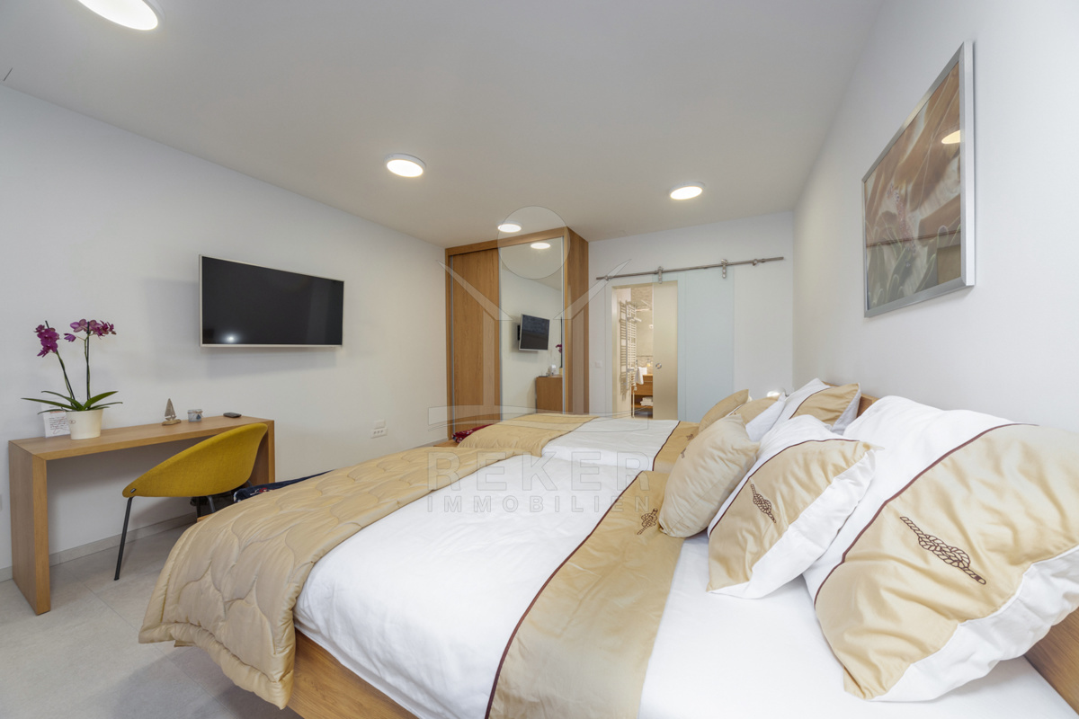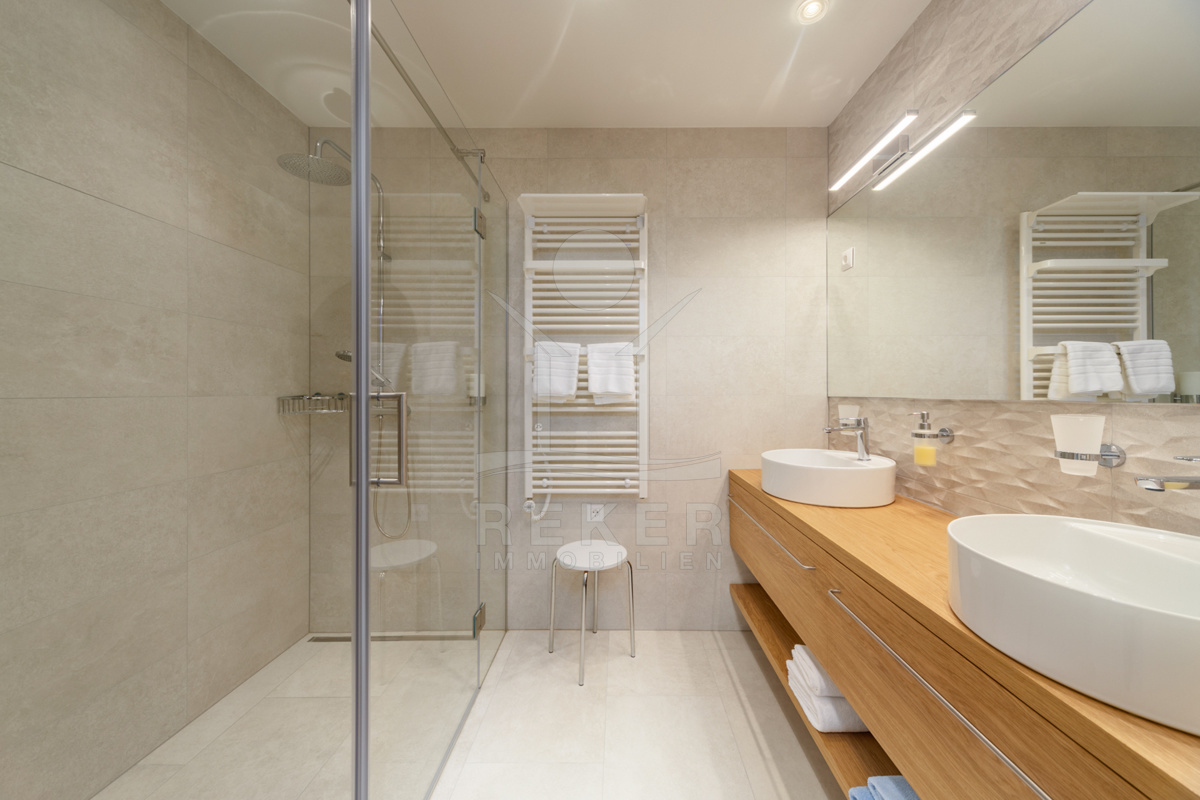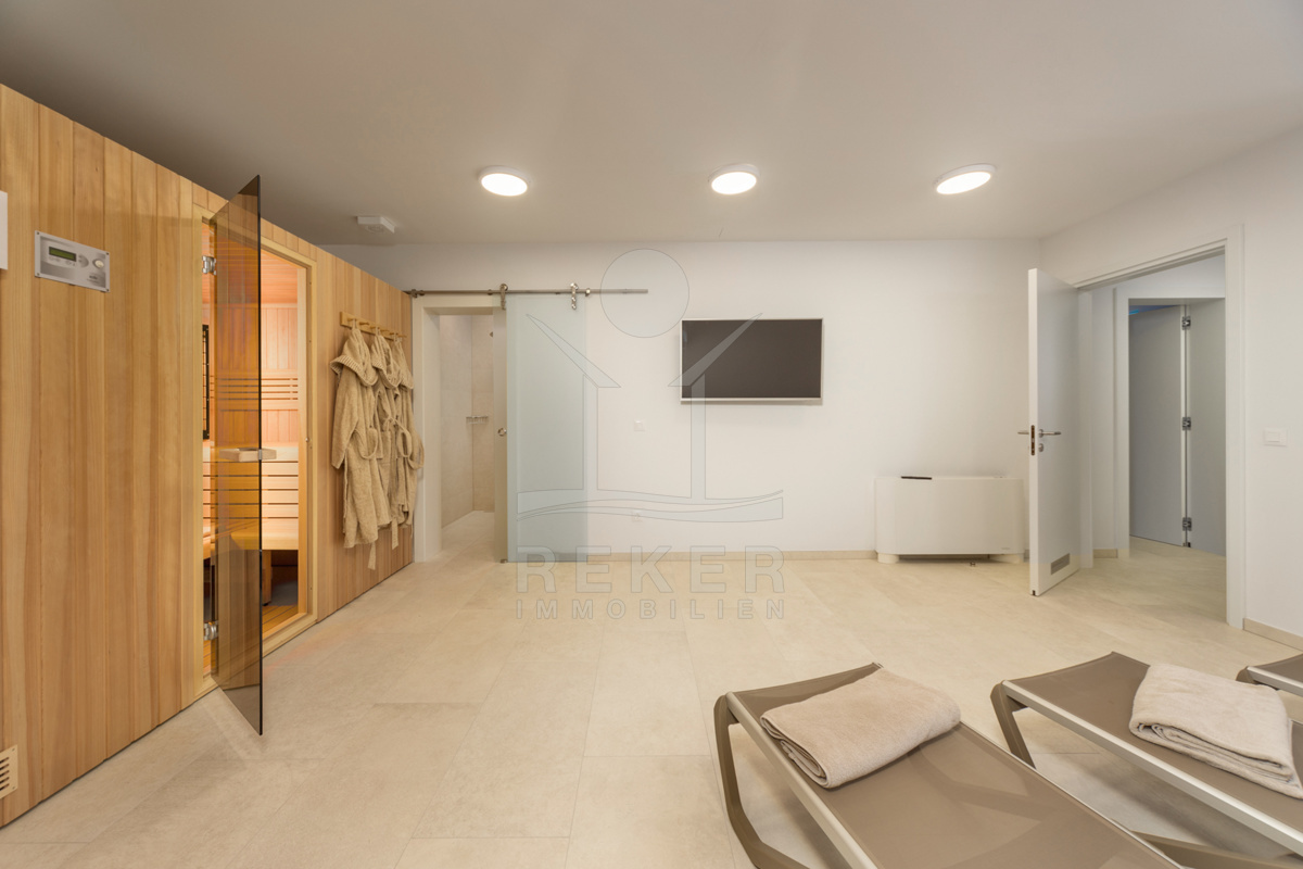 Für Erholung sorgt eine großzügige Sauna mit finnischer und Infrarot-Technik. Sie bietet Platz für bis zu acht Personen. Eine Lounge mit Dusche, Kühlschrank und TV macht diesen Bereich besonders attraktiv, vor allem in Verbindung mit dem Pool. Ein Fitnessraum, Abstellflächen und eine Garage mit Stauraum für Sportgeräte runden das Angebot ab. Die Villa wurde 2020 in massiver Bauweise errichtet und trägt das Energiezertifikat A. Durch die Ost-West-Ausrichtung erleben Sie farbenprächtige Sonnenaufgänge und eindrucksvolle Sonnenuntergänge.
