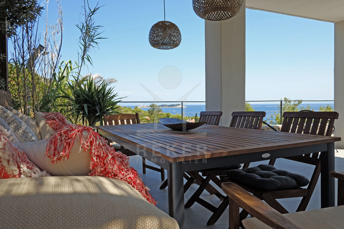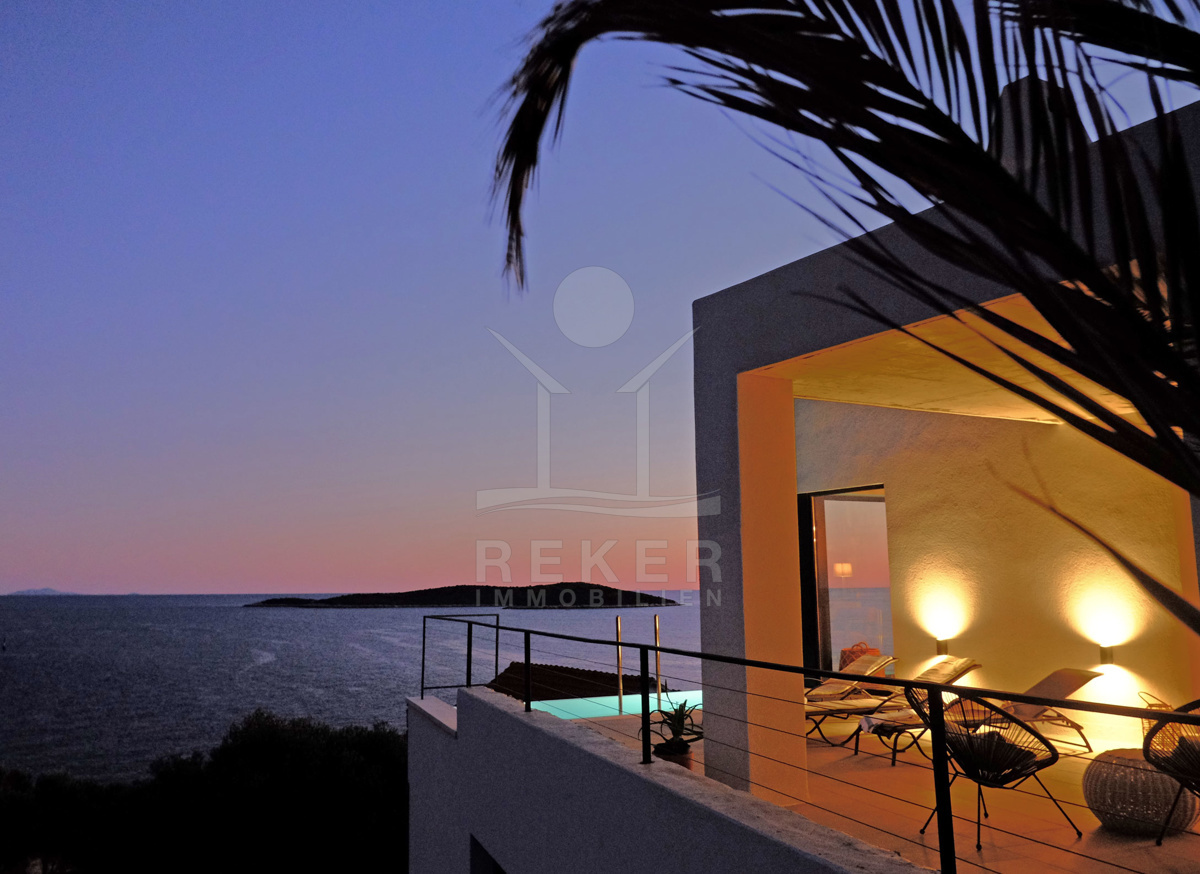 Nach Osten ausgerichtete Balkone und Terrassen bieten unvergleichbare Sonnenaufgänge mit überwältigendem Meerblick. Auf dem Grundstück der 2021 errichteten Luxus-Villa finden Sie zwei Stellplätze für Ihre Autos. Besonderes Highlight ist der eigene Bootsanleger!