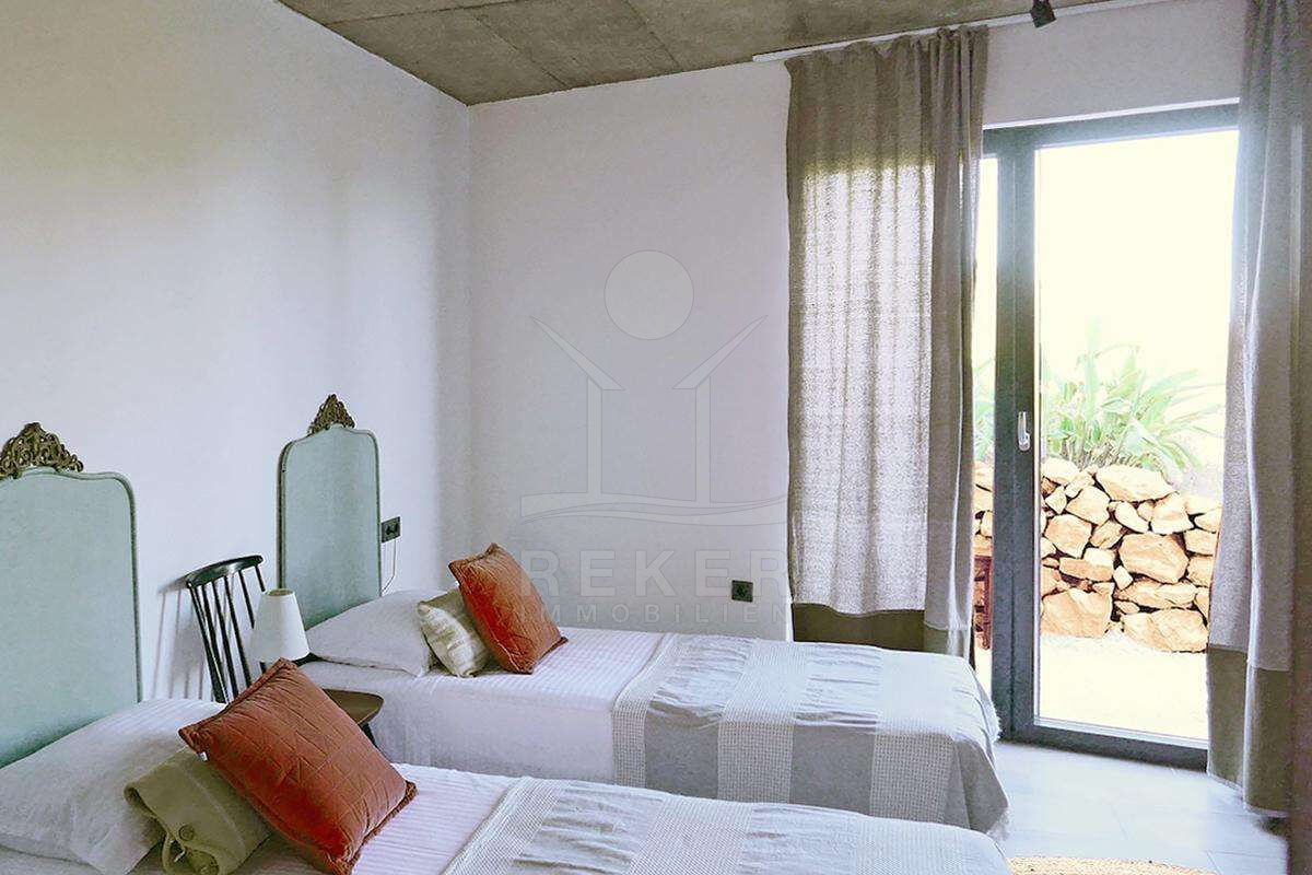 Insgesamt 4 Zimmer verteilen sich hier auf die beiden Stockwerke. 3 Schlafzimmer und 3 Badezimmer befinden sich im Erdgeschoss, während der großzügige Wohnbereich, die Küche, das Esszimmer, sowie Gäste-WC und Abstellraum im Obergeschoss sind. Die gesamte Villa ist stilvoll und luxuriös möbliert.