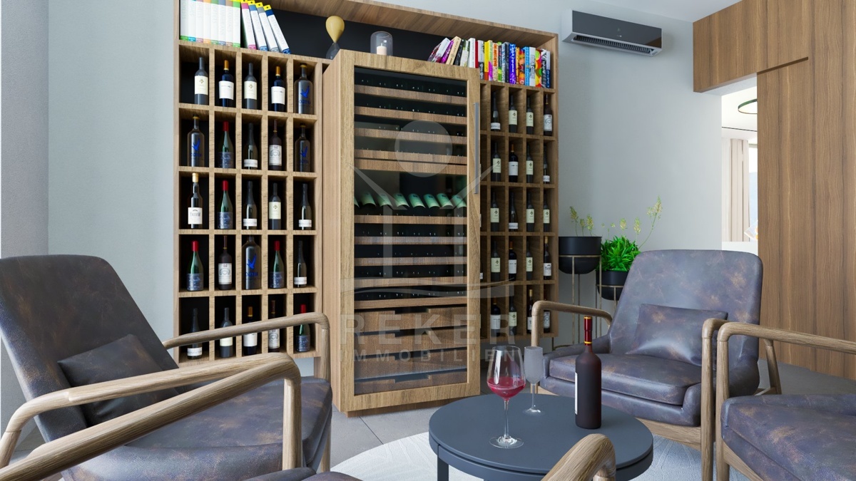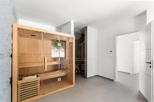 Die Villa selbst umfasst 419 m² auf zwei Etagen. Im Erdgeschoss erwarten Sie Sauna, Fitnessraum, Degustationsraum, ein Multifunktionsraum und ein großzügiger Wohnbereich mit Kamin. Große Glasfronten öffnen sich direkt in den Garten. Im Obergeschoss befinden sich vier Schlafzimmer mit jeweils eigenem Bad. Das Master-Schlafzimmer punktet mit einem Bad samt Wanne. Alle Zimmer haben Zugang zu einer großen Gemeinschaftsterrasse mit Whirlpool und Sonnenplätzen. Wo sonst könnten Sie die Aussicht besser genießen?