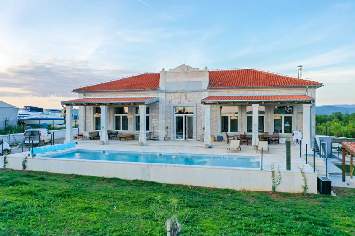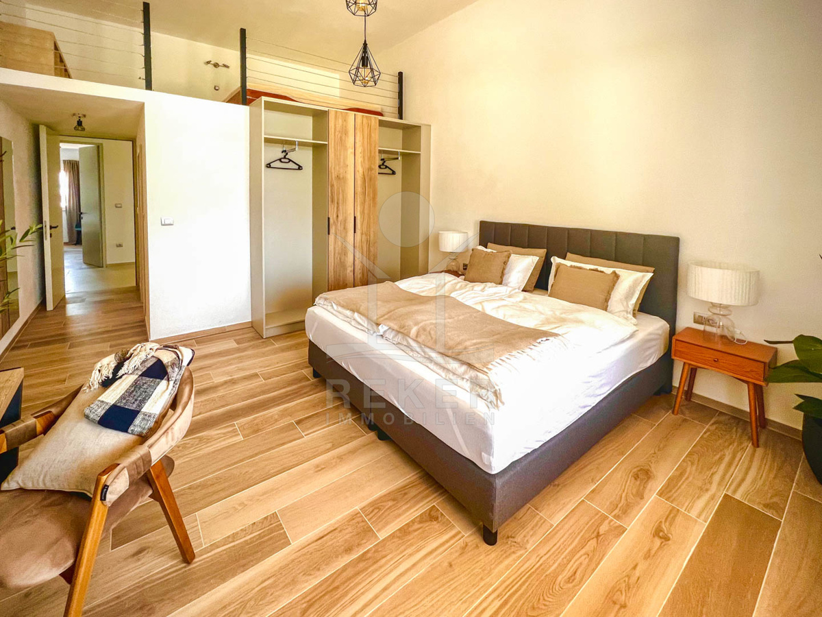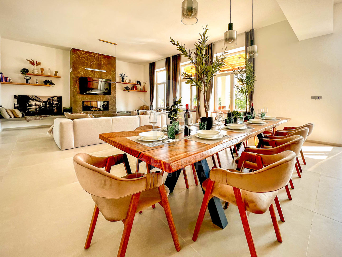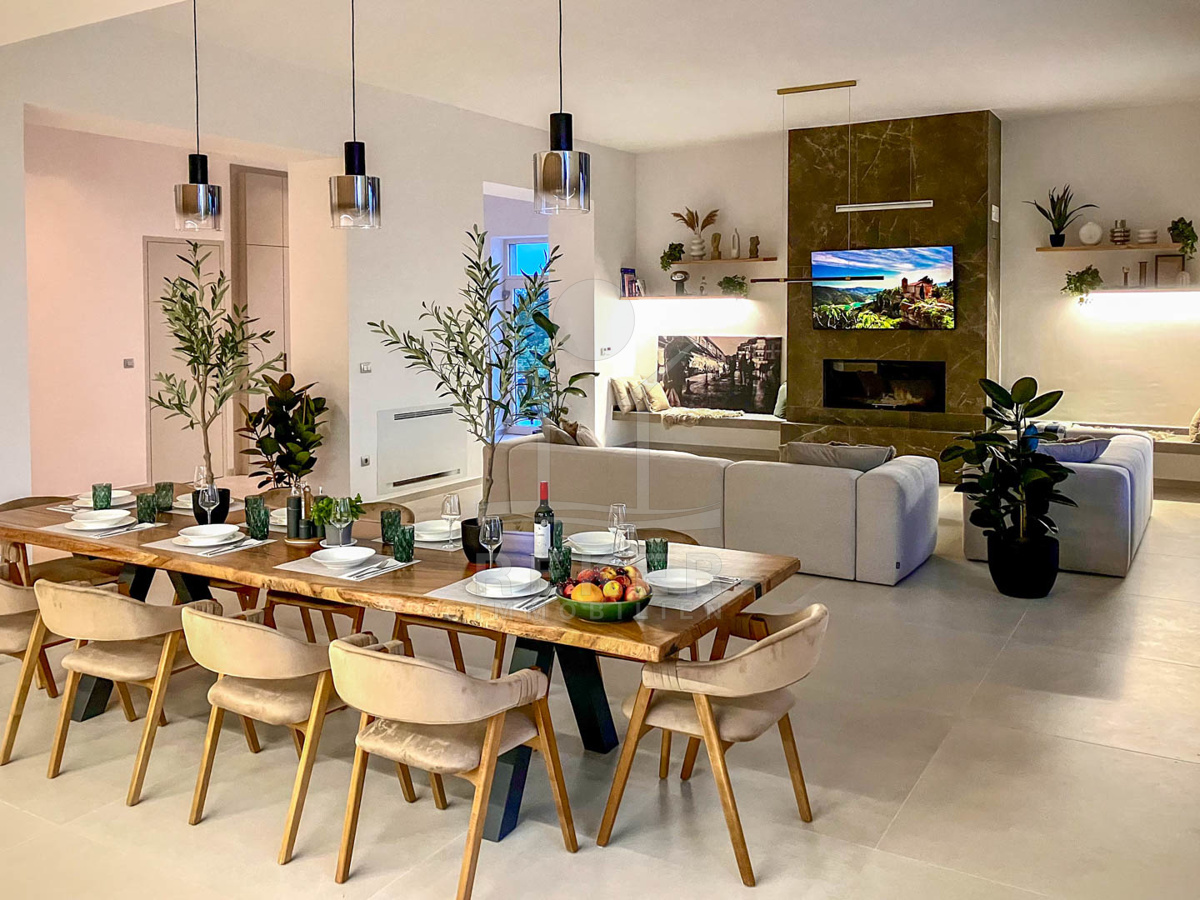 Die luxuriöse Villa bietet eine Fußbodenheizung und eine Klimaanlage für höchsten Komfort in jedem Raum. Bei der Dekoration der Immobilie wurde auf jedes Detail geachtet und sie ist mit hochwertigen Möbeln ausgestattet. Im südwestlichen Teil des Hauses befinden sich ein offener Wohn- und Essbereich sowie eine erstklassige Küche.