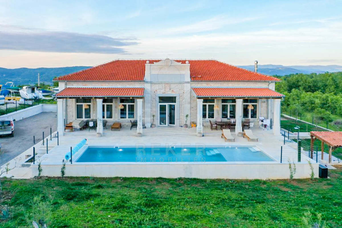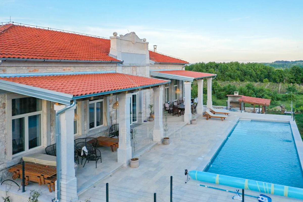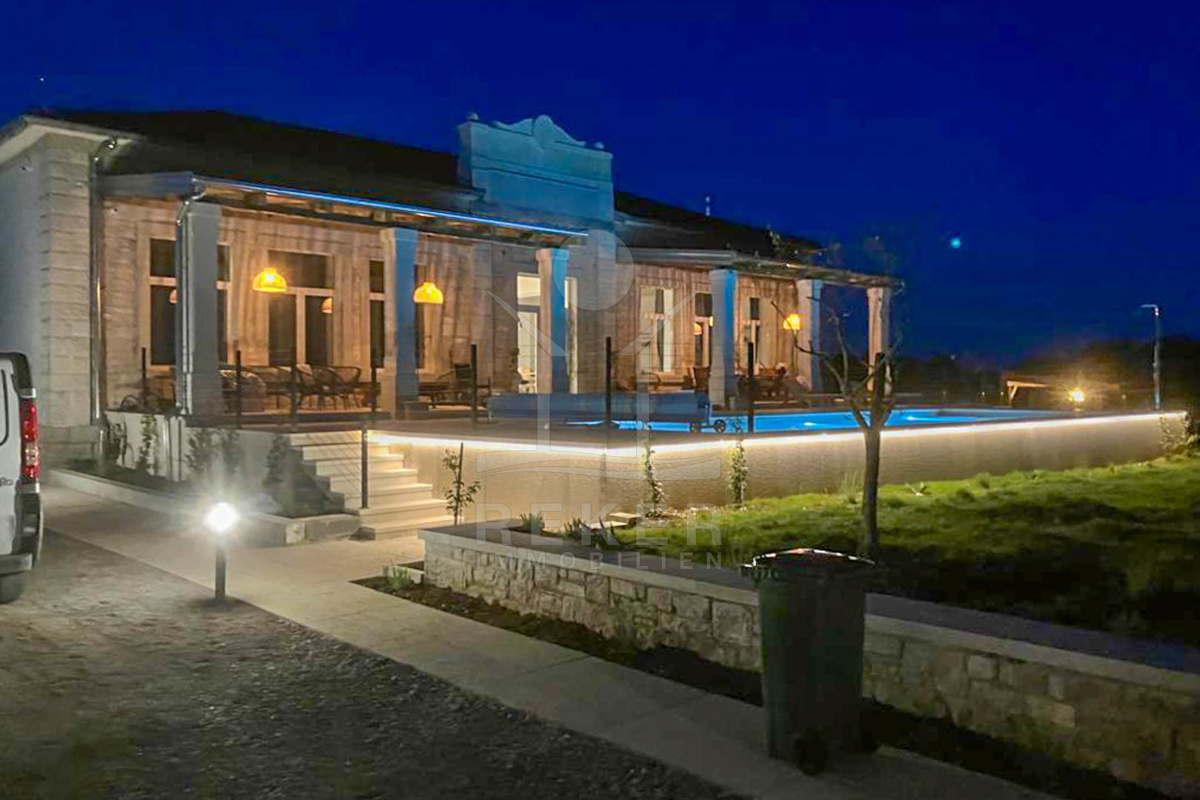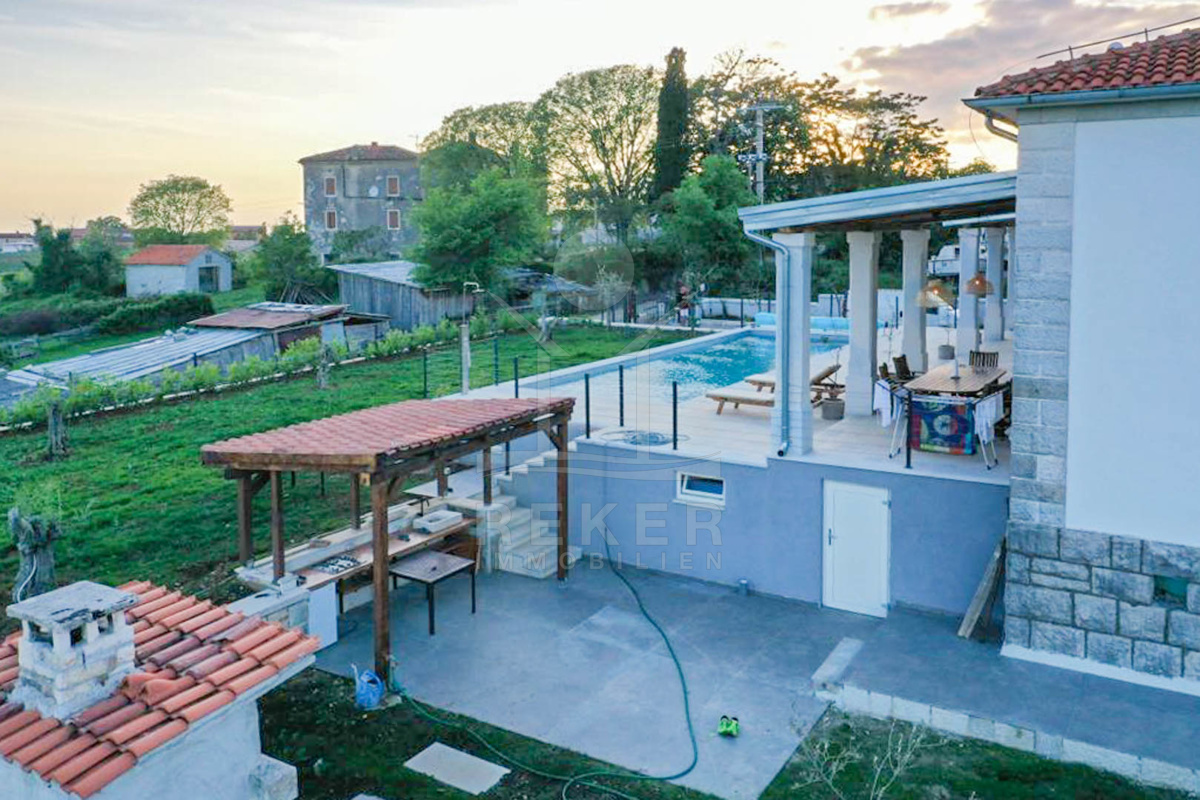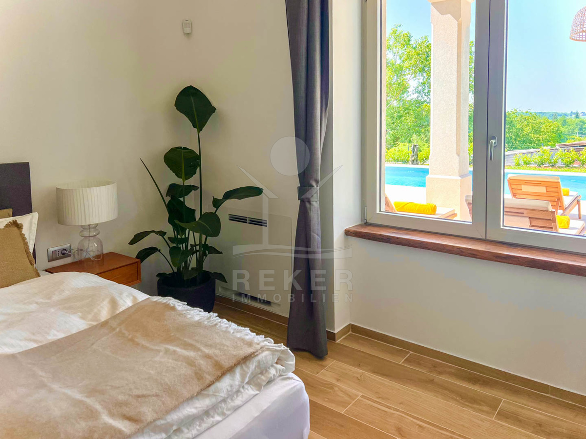 Die elegante Villa befindet sich in einer grünen und idyllischen Umgebung, nur eine kurze Fahrt von Vižinada entfernt. Umgeben von sattgrünen Wiesen und Wäldern, können Sie hier die Ruhe und Natur genießen. Trotz der Abgeschiedenheit liegt das Meer nur 14 km entfernt, sodass Sie auch die traumhaften Strände der Region schnell erreichen können. Das Zentrum von Poreč, bekannt für seine historische Altstadt und lebendige Atmosphäre, ist ebenfalls nur 20 km entfernt. Hier finden Sie zahlreiche Einkaufsmöglichkeiten und kulturelle Attraktionen. Diese einzigartige Lage bietet somit eine perfekte Mischung aus Ruhe und Nähe zu den Annehmlichkeiten der nahegelegenen Städte.