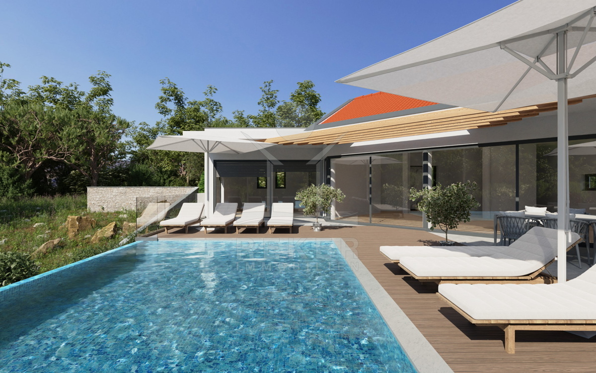 Die Außenbereiche dieser Villa verspricht eine Wohlfühloase, die ganzjährig Entspannung und Freizeitaktivitäten im Freien ermöglicht. Eine einladende überdachte Terrasse lädt zum Verweilen ein, während der Pool und die Sonnenliegeplätze ideale Orte zum Sonnenbaden und Entspannen darstellen. Ein Grillbereich bietet die Möglichkeit, gesellige Stunden mit Familie und Freunden zu verbringen. Diese Neubauvilla verspricht nicht nur eine moderne Wohnatmosphäre, sondern auch ein vielfältiges Outdoor-Erlebnis.