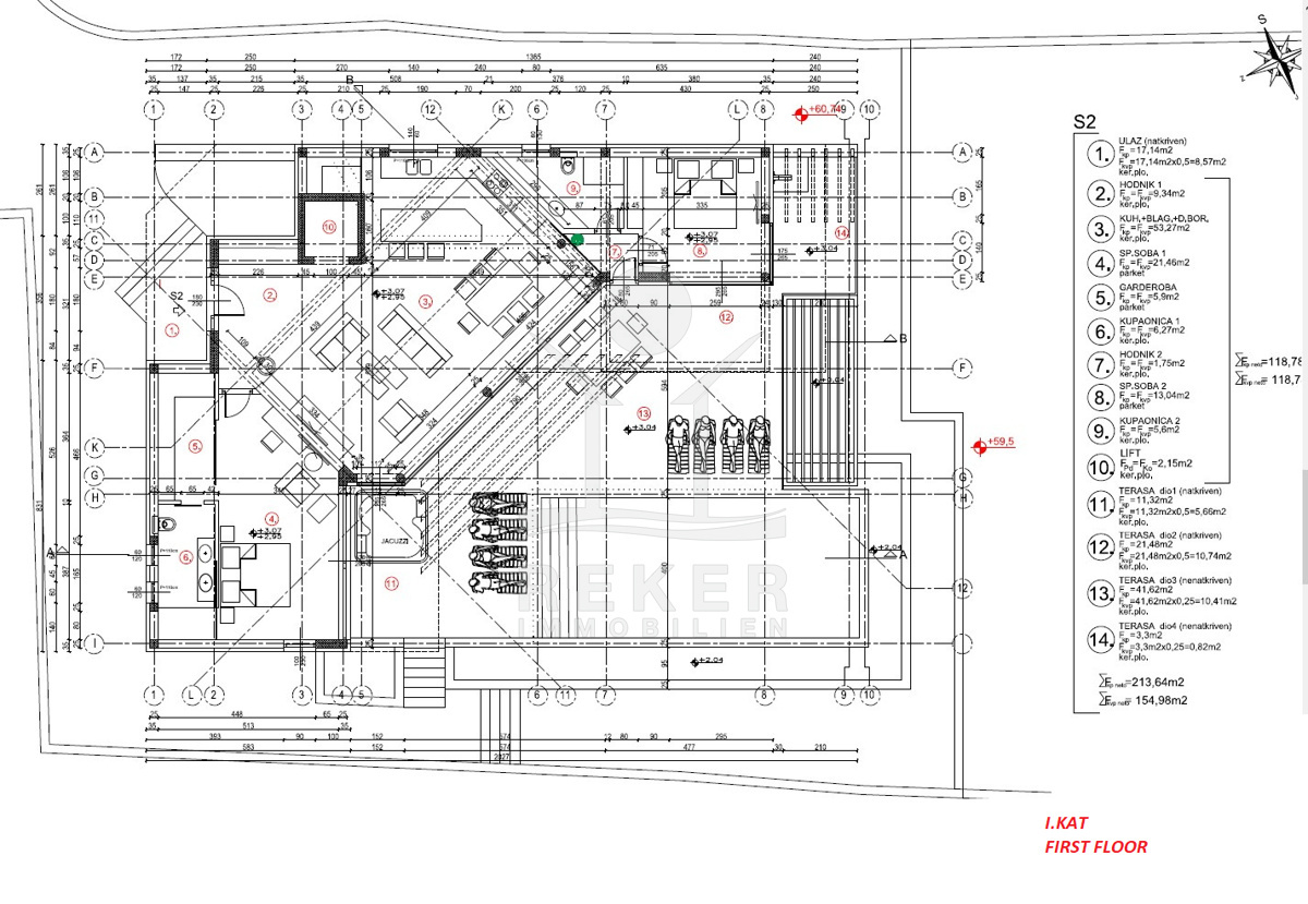 Der erste Stock mit einer Nettofläche von 213 m² beherbergt eine 2-Zimmer-Wohnung mit überdachtem Eingang, Garderobe, 2 Schlafzimmern und Bädern, Küche mit Ess- und Wohnzimmer, überdachter Terrasse sowie drei weiteren Terrassen. Ein Aufzug sorgt für Komfort auch in dieser Etage.