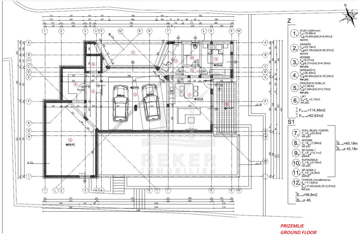 Die Villa bietet auf insgesamt zwei Etagen großzügigen Wohnraum. Im Erdgeschoss erstreckt sich auf 56,80 m² ein Eingangsbereich, Flur, Wohn-/Esszimmer mit offener Küche, Badezimmer, 2 Schlafzimmern, Abstellraum und Waschraum, alles bequem erreichbar dank Aufzug.