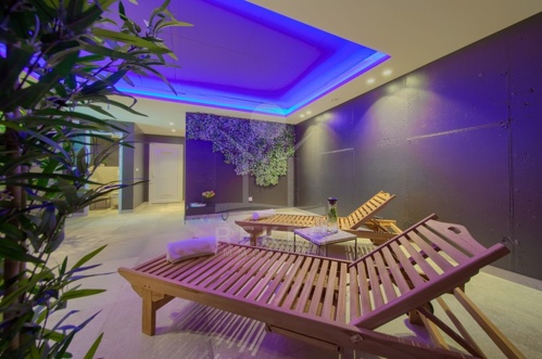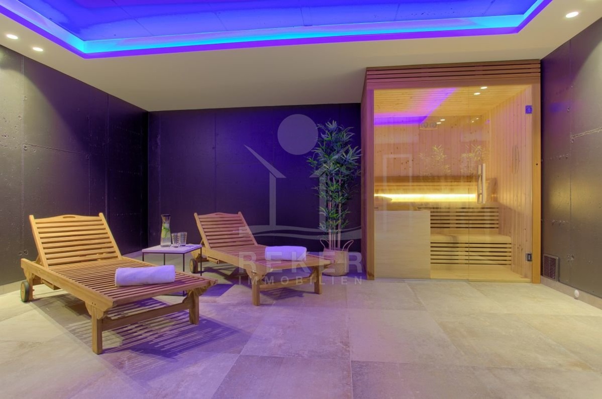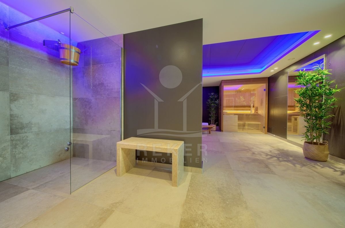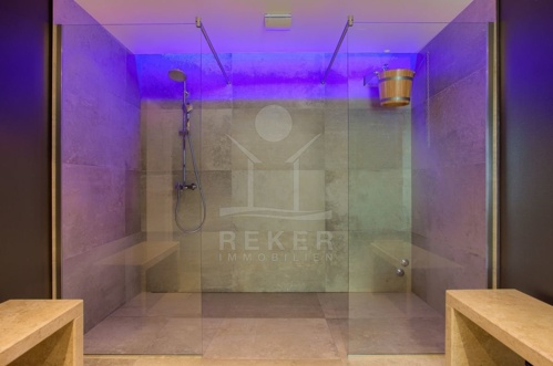 Der schöne Wellnessbereich im Keller der Villa bietet eben der Sauna, einen Ruhebereich und eine typische Sauna-Dusche fürs kalte Abschauern.