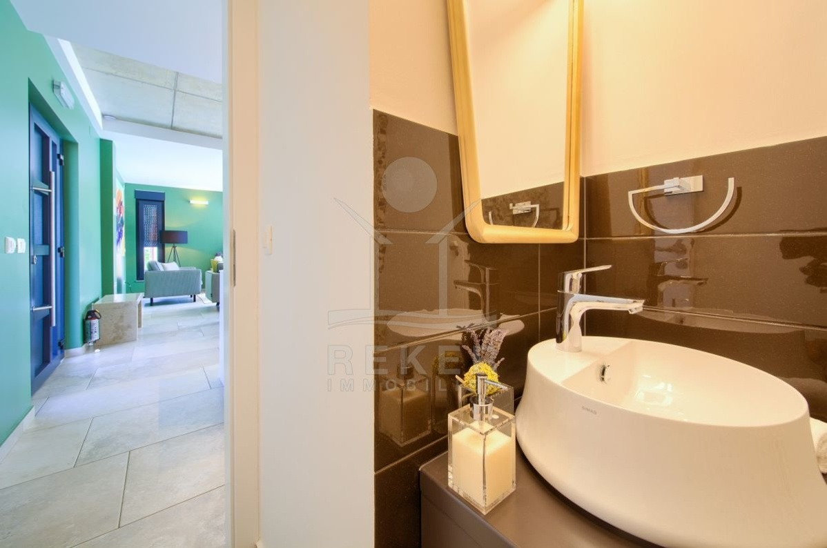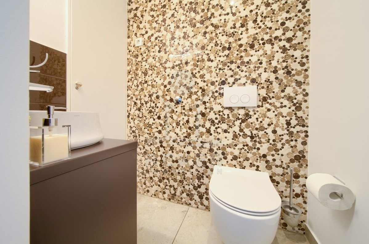 Das Gäste-WC verfügt über hochwertige Fliesen und moderne zeitlos gestaltete Sanitärobjekte.